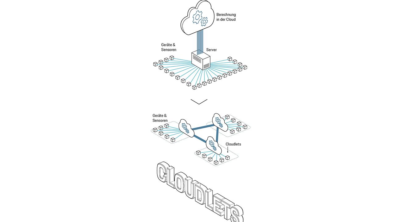 Verteilte Rechenleistung: Für minimale Latenzzeiten ist beim 5G-Netz eine dezentrale Lösung geplant, bei der jede Sendestation einen eigenen Rechner erhält. So bilden sich viele einzelne Mini-Datenclouds, genannt „Cloudlets“.