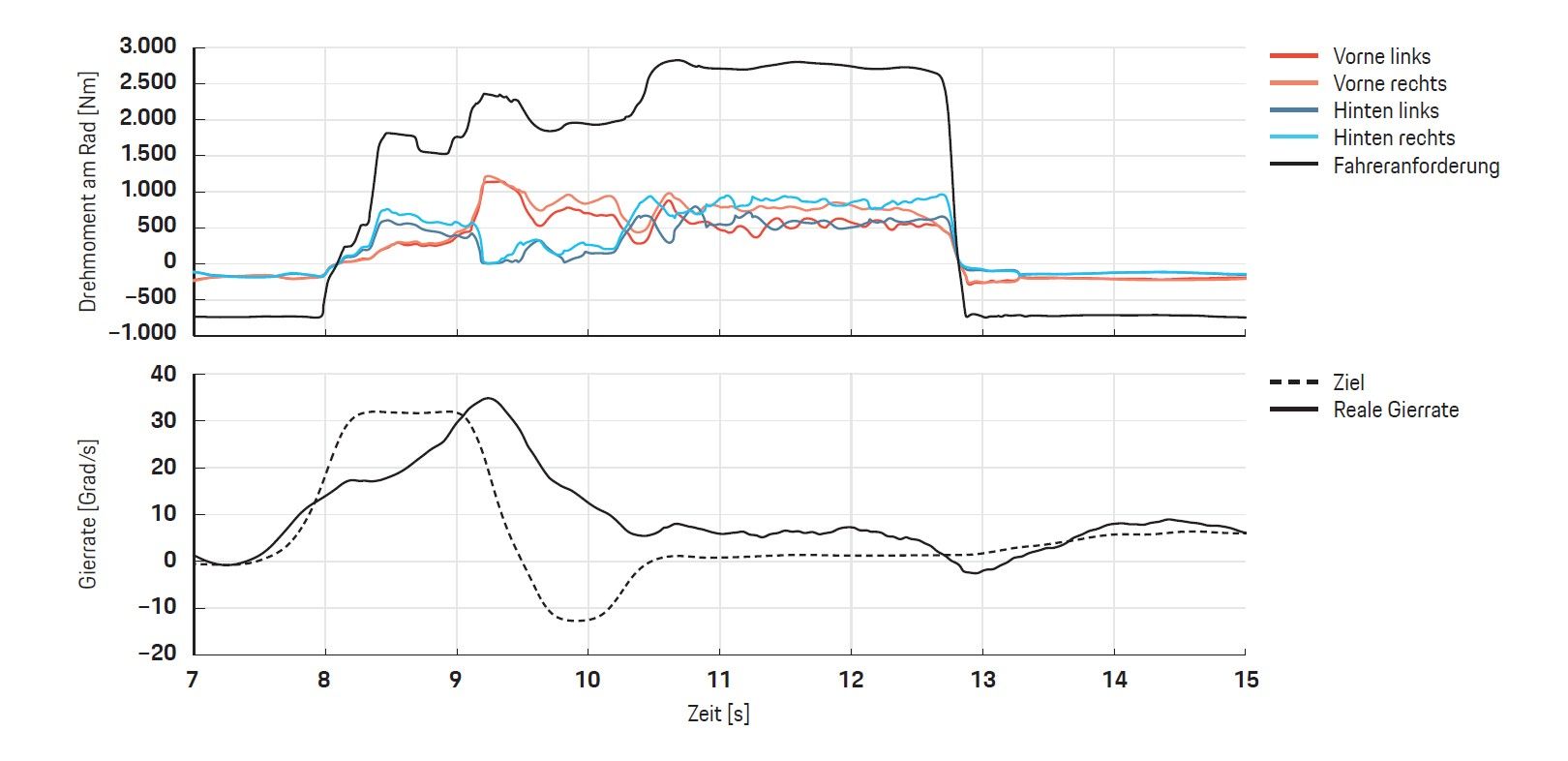 Die Gierrate beschreibt, wie schnell sich ein Fahrzeug in einer Kurve um die eigene Achse dreht. Die beiden unteren Linien zeigen die vom Fahrer gewünschte Gierrate (gestrichelt) und die gemessene Gierrate (durchgezogen). Die vier Linien oben (rot, orange, dunkelblau, hellblau) zeigen die Antriebsmomente, die schwarze Linie ganz oben die Gaspedalposition. Man sieht, dass das Auto zuerst untersteuert. Bei etwa neun Sekunden rutscht die Hinterachse weg, und das Auto beginnt zu schleudern. Ab ca. 10,5 Sekunden stabilisiert sich das Fahrverhalten zu einem moderaten Untersteuern. Die Antriebsmomente liegen hauptsächlich an den beiden rechten Rädern.