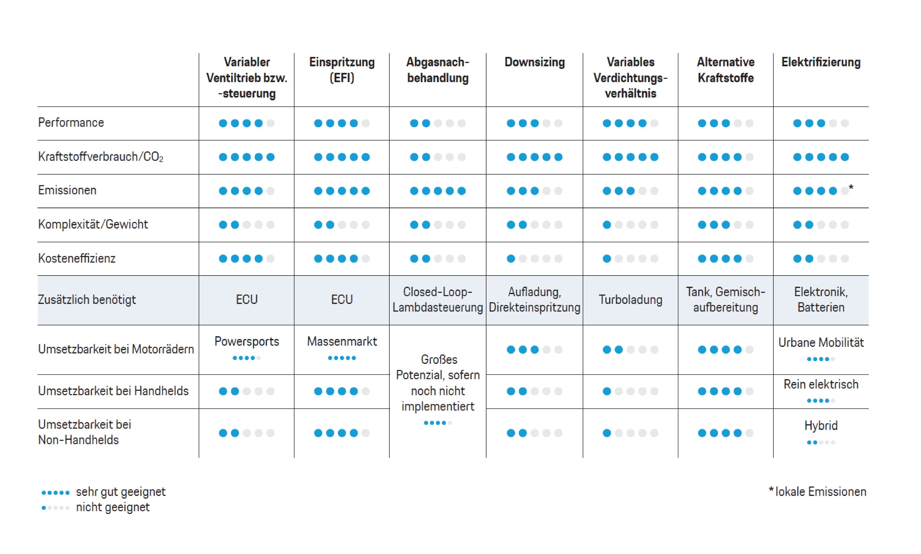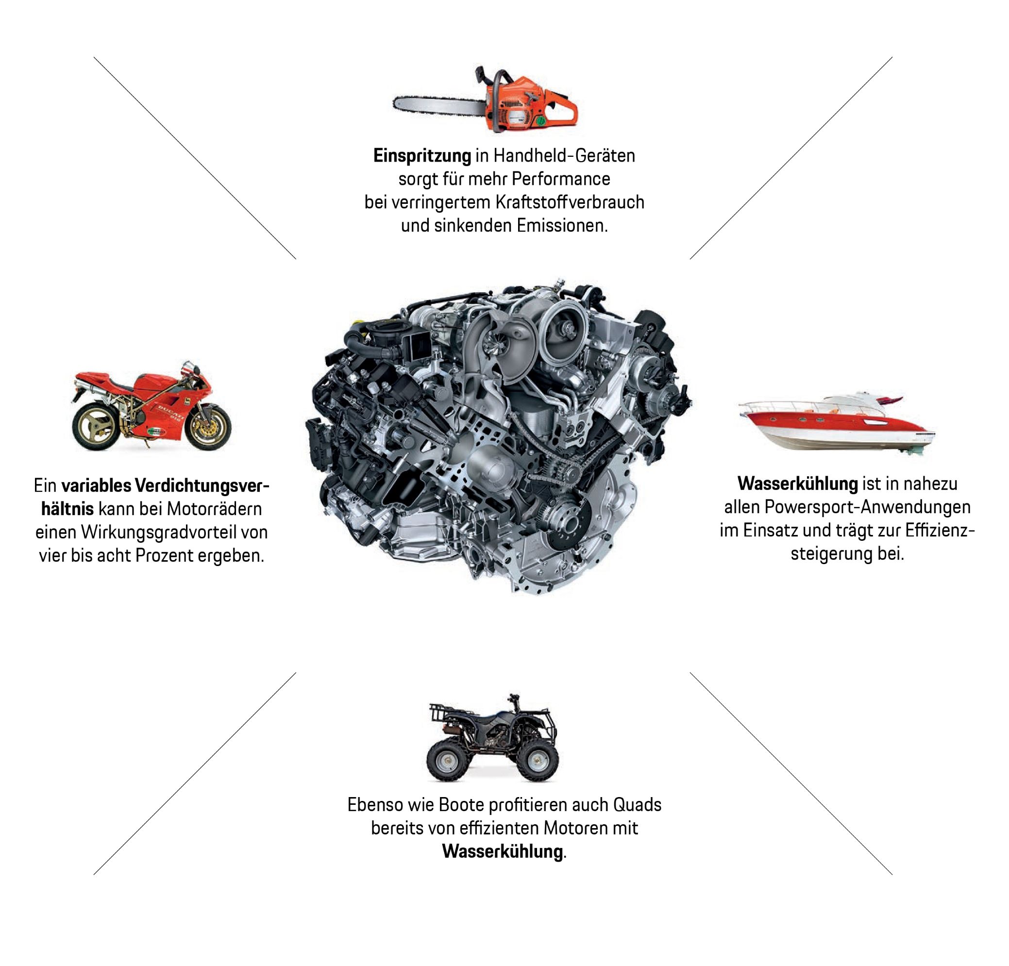 Porsche Engineering ist mit allen Effizienz- und Umweltschutz-Technologien aus dem Ottomotoren-Bereich vertraut und kann Unternehmen aus dem Non-Automotive-Bereich beim Transfer in ihre Produkte unterstützen – immer unter Berücksichtigung der spezifischen Anforderungen wie geringe Kosten oder möglichst niedriges Gewicht. Allerdings ist nicht jede Technologie für jedes Produkt sinnvoll. „Eine genaue Analyse muss in jedem Einzelfall zeigen, ob sich die gesteckten Ziele wirtschaftlich sinnvoll erreichen lassen“, sagt Fuoss. Für eine bessere Orientierung haben die Experten von Porsche Engineering Technologien auf ihren Einsatz in Motorrädern sowie Handheld- und Non-Handheld-Geräten untersucht: alternative Kraftstoffe, Einspritzung, Abgasnachbehandlung, variable Ventiltriebe, variable Verdichtung, Down- bzw. Rightsizing, Elektrifizierung und Wasserkühlung.