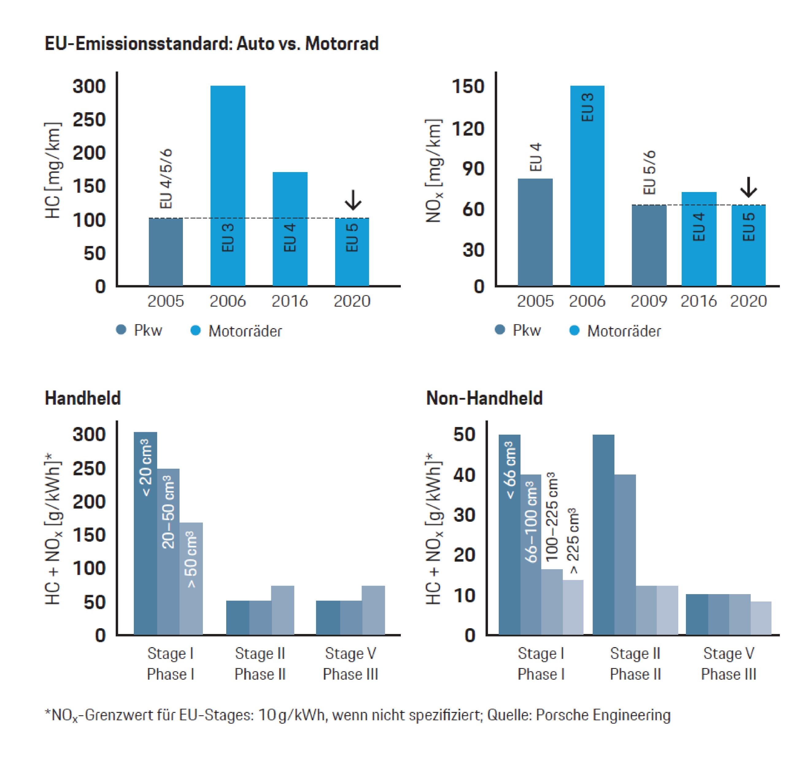 Ähnlich wie im Automotive-Bereich gelten auch bei Motorrädern, Handheld- und Non-Handheld-Geräten Grenzwerte für Kohlenmonoxid, Kohlenwasserstoffe und Stickoxide, die zunehmend verschärft werden. Um sie einhalten zu können, ist der Transfer von Effizienztechnologien aus dem Pkw-Bereich erforderlich.