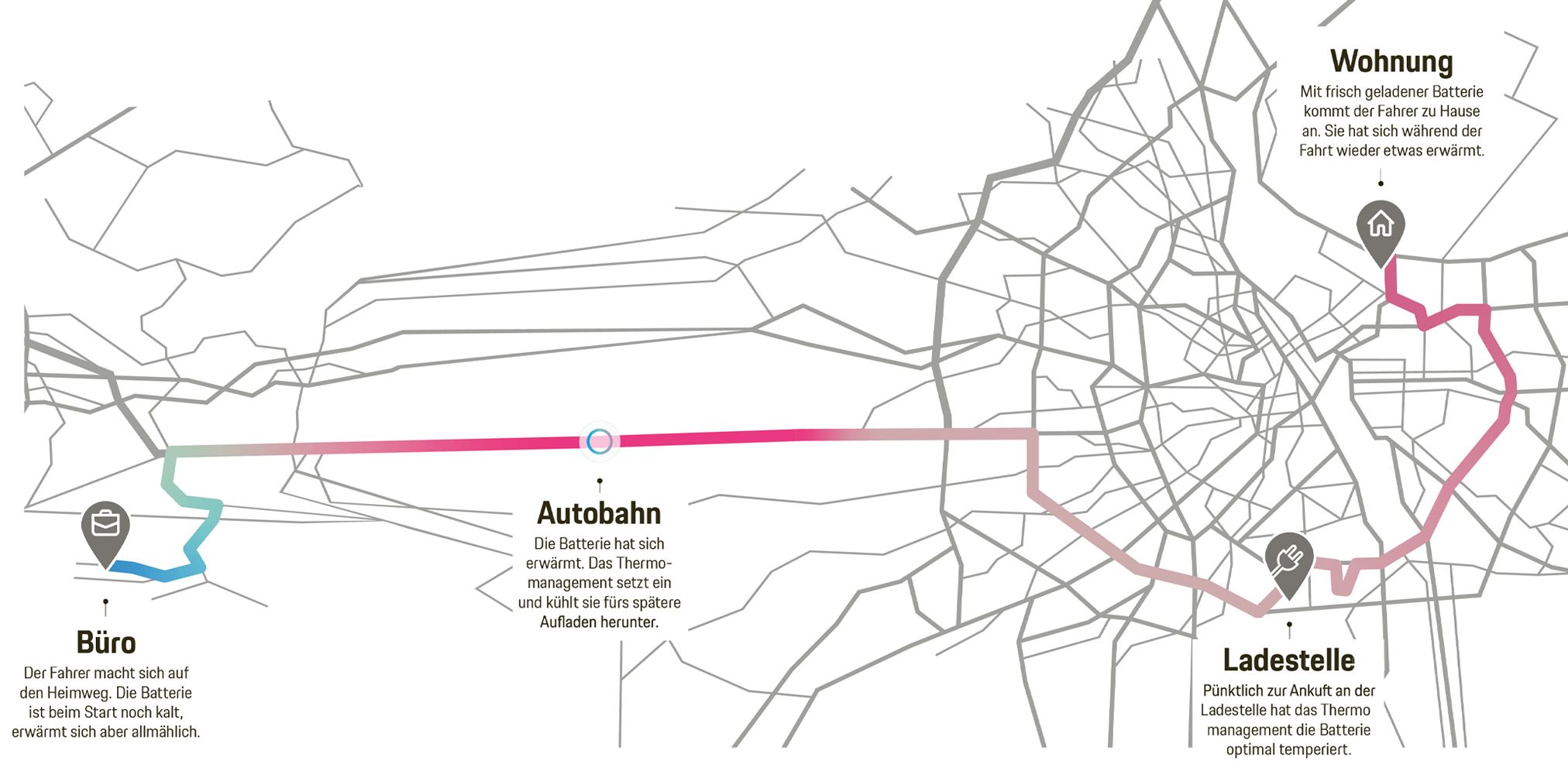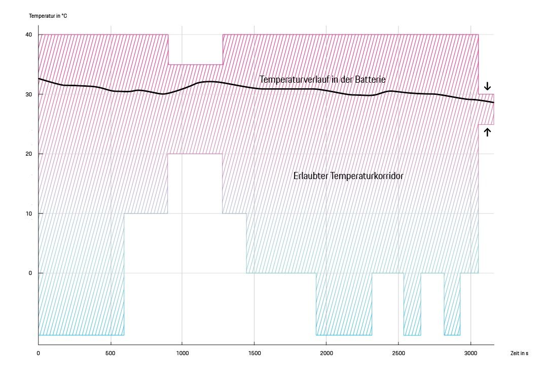 Immer im Korridor: Auch während der Fahrt muss die Batterie in einem bestimmten Temperaturbereich sein. Er hängt vor allem davon ab, ob das Fahrzeug auf der Autobahn, über Land oder in der Stadt unterwegs ist.