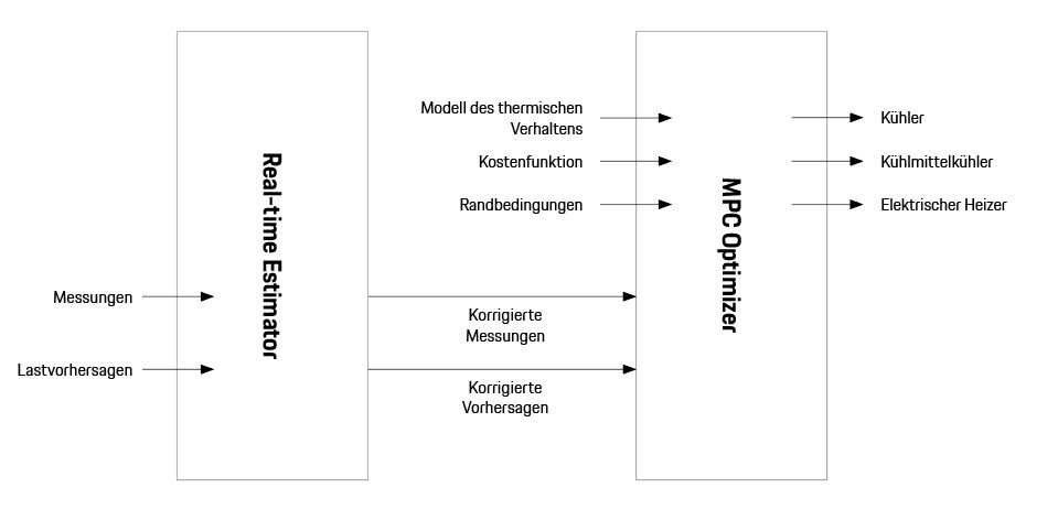 Der Real-time Estimator (RTE) sagt voraus, welche thermische Last das Fahrzeug in Zukunft (zum Beispiel in 40 Minuten) erzeugen wird. Dazu kombiniert er den aktuellen Zustand des Fahrzeugs, von außen gelieferte Lastvorhersagen und das Modell des Fahrzeugverhaltens. Der MPC Optimizer (Model Predictive Control) steuert das Heiz- und Kühlsystem, wobei er neben den Berechnungen des RTE auch Anforderungen an Komfort und Effizienz berücksichtigt (ausgedrückt durch die Kostenfunktion und die Randbedingungen).