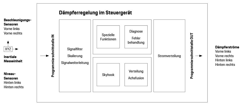Um die geforderten Fahreigenschaften zu erreichen, haben die Ingenieure für die Dämpferregelung der Vorder- und Hinterachse eine spezielle elektronische Systemarchitektur entwickelt. Mit ihr lässt sich die Dämpferreglung an die Steuersysteme im jeweiligen Zielfahrzeug optimal anpassen. Zugleich unterstützt sie verschiedene Sensoranordnungen, wodurch man maßgeschneiderte Lösungen in kurzer Zeit und zu geringen Kosten umsetzen kann. „Diese Art der softwarebasierten Regelung ist komplex“, sagt Braun. „Sie erlaubt es aber, die Produktionskosten gering zu halten, da zahlreiche Komfort- und Fahrdynamikfunktionen hauptsächlich durch Algorithmen abgebildet werden.“