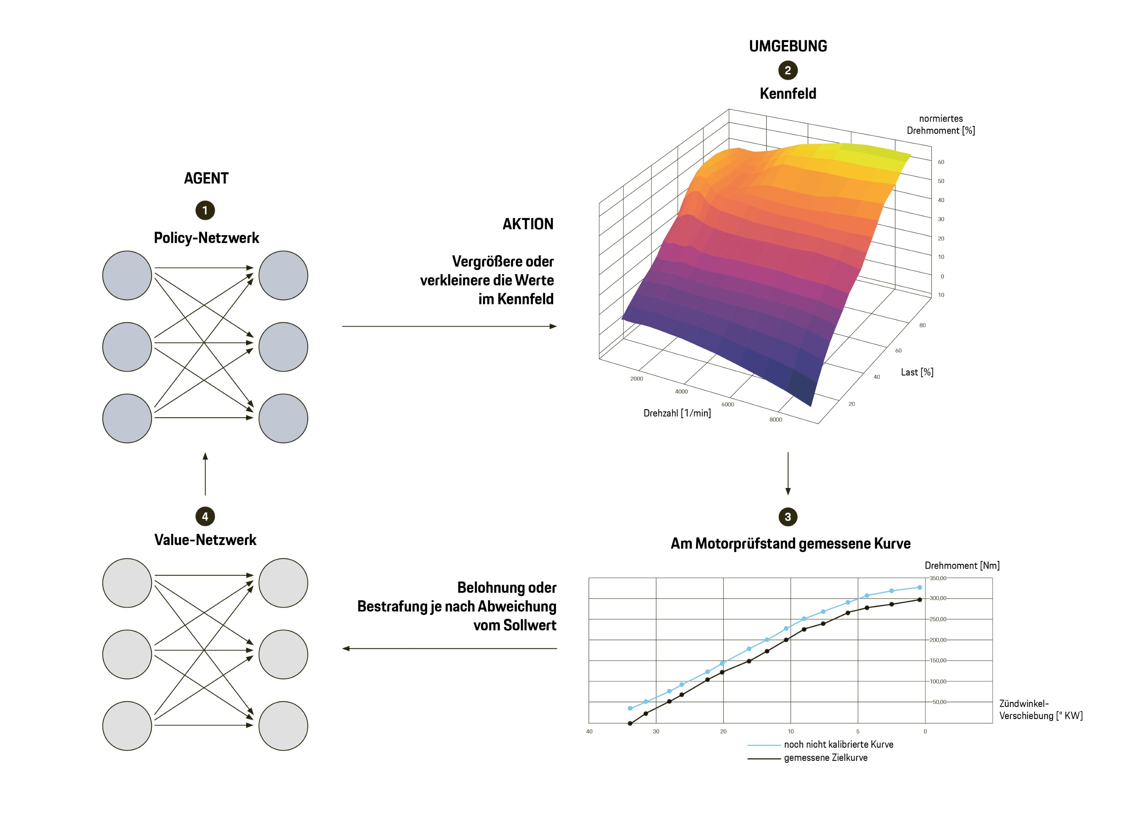 Während des Trainings lernt das System die optimale Applikationsmethodik für die Kalibrierung des vorgegebenen Drehmomentmodells. An charakteristischen Stellen im Kennfeld vergleicht es dazu den kalibrierten Wert mit dem Wert aus dem Messdatensatz und approximiert anhand der resultierenden Belohnungen mithilfe neuronaler Netze eine Nutzfunktion. Durch das erste neuronale Netz können dabei Belohnungen für bis dato unbekannte Zustände abgeschätzt werden. Ein zweites neuronales Netz, das sogenannte Policy Network, prognostiziert dann, welche Aktion in einem bestimmten Zustand den höchsten Nutzen bringen wird.