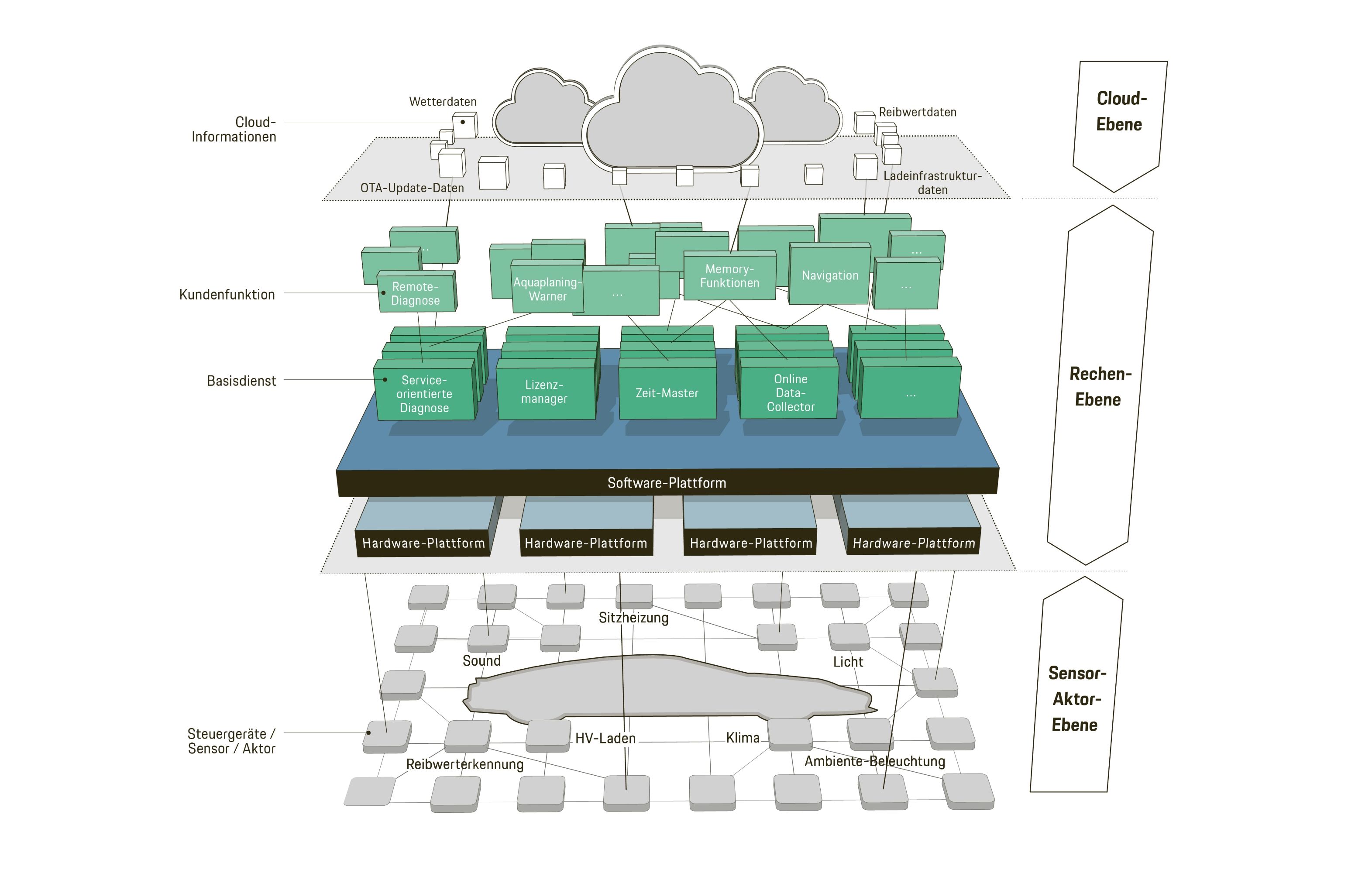 Die Fahrzeuge der Zukunft werden revolutionäre Funktionen aufweisen. Neben aktuellen Trends wie Elektromobilität, Konnektivität und autonomes Fahren tritt die Notwendigkeit zur Vernetzung des Fahrzeugs mit der Umwelt immer stärker in den Fokus künftiger Architekturen. Anwendungen in Themenfeldern wie Remote-Update und -Diagnose, Car-2-Infrastructure, Big-Data- und Cloud-Funktionen werden in Zukunft eine immer größere Rolle spielen. Um moderne Funktionen im Fahrzeug umzusetzen und dieses somit für den Kunden aktuell und leistungsfähig zu halten, entwickelt Porsche kontinuierlich eine neue E³-Architektur (End-2-End-Elektronikarchitektur) weiter. Ihr Aufbau ist offen und modular – auf Basis eines ganzheitlichen Ansatzes einer End-to-End-Architektur mit einem Vehicle Backend als integralem Bestandteil. Sie umfasst mehrere Ebenen: Auf der Sensor-Aktor-Ebene befinden sich unter anderem Funktionen wie Sound, Licht, Heizung oder Ambiente-Beleuchtung. Auf der Rechen-Ebene laufen die Basisdienste und die Kundenfunktionen wie Navigation, Remote-Diagnose oder der Aquaplaning-Warner. Die letzte Ebene ist die Cloud-Ebene: Hier befinden sich Informationen, die in der Cloud gespeichert werden wie zum Beispiel Wetter- oder Reibwertdaten. Neben neuen Anforderungen an die technische Infrastruktur, wie zum Beispiel hochleistungsfähige zentrale Recheneinheiten, High-Speed-Vernetzung, neue Diagnosekonzepte und adäquate Security-Konzepte, stellt die E³-Architektur auch die Berücksichtigung entsprechender Veränderungen im Umfeld zugehöriger Entwicklungsprozesse und Kooperationsmodelle in den Mittelpunkt. Der Trend zur Funktionsverschiebung vom Fahrzeug in das Vehicle Backend erfordert eine durchgängige und serviceorientierte Softwarearchitektur – sowohl im Fahrzeug als auch im Backend. Sie ermöglicht die domänenübergreifende Interoperabilität aller Dienste sowie die nahtlose Nutzbarkeit von leistungsstarken Cloud-Services. Mithilfe der E³-Architektur integriert sich das Fahrzeug in ein Gesamtökosystem aus Diensten, das dem Kunden in Zukunft eine Vielfalt neuer Funktionen bereitstellt – und ein neues Niveau von Komfort und Mobilität ermöglicht.