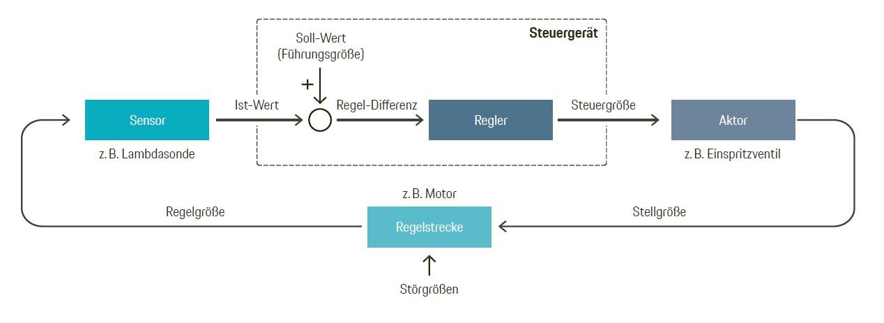 Sensoren liefern den Input für das elektronische Steuergerät, das diese gemessenen Ist-Werte mit Soll-Werten vergleicht. Weichen die Ist-Werte von den Soll-Werten ab, veranlasst das Steuergerät über Aktoren entsprechende Korrekturen.