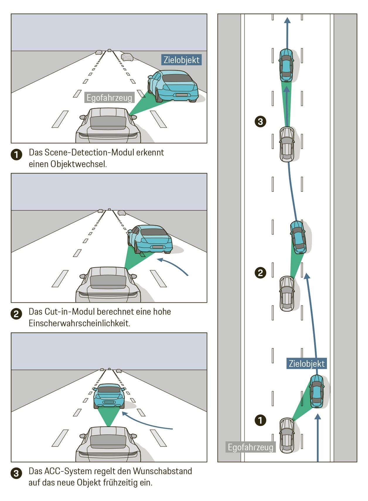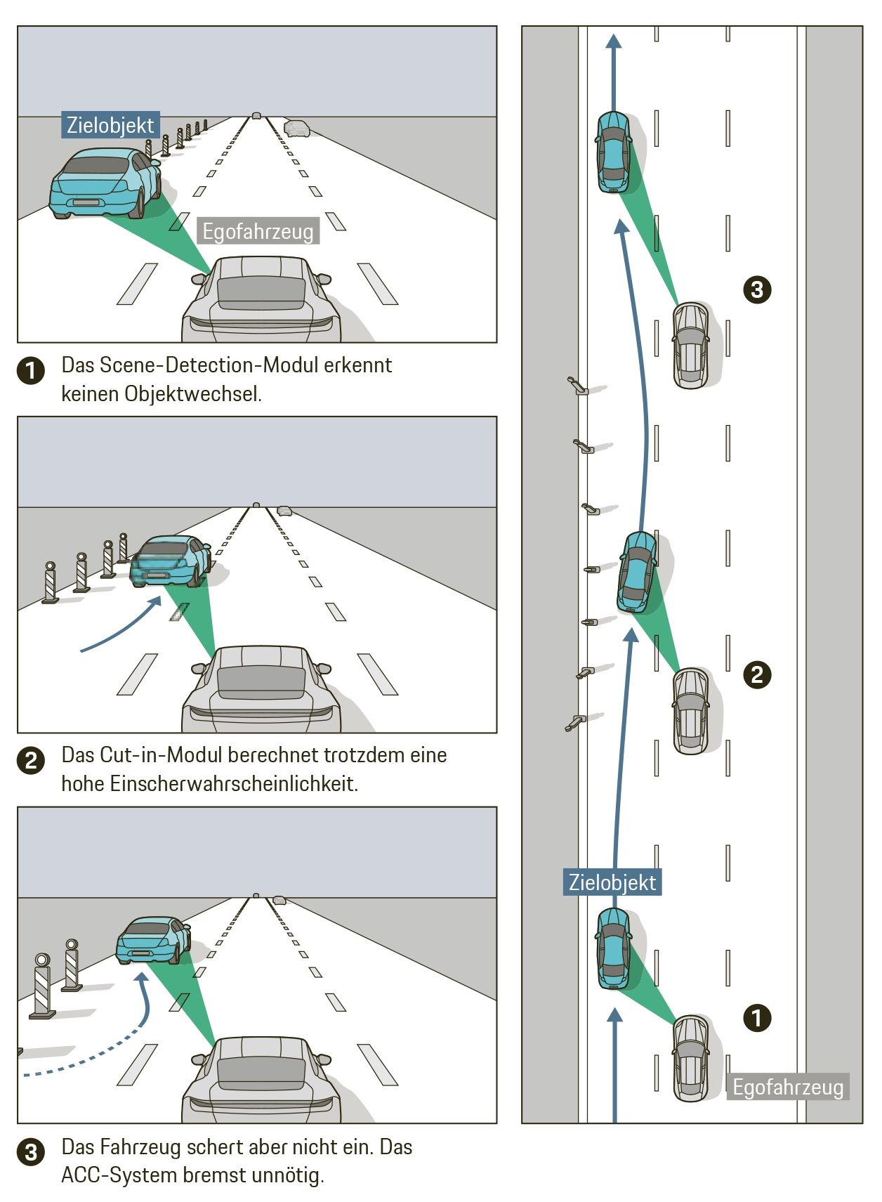 Die Einscher-Erkennung sollte auch erkennen, dass ein Fahrzeug zwar nach rechts pendelt, aber trotzdem nicht einscheren wird. So lassen sich unnötige Bremsmanöver vermeiden.