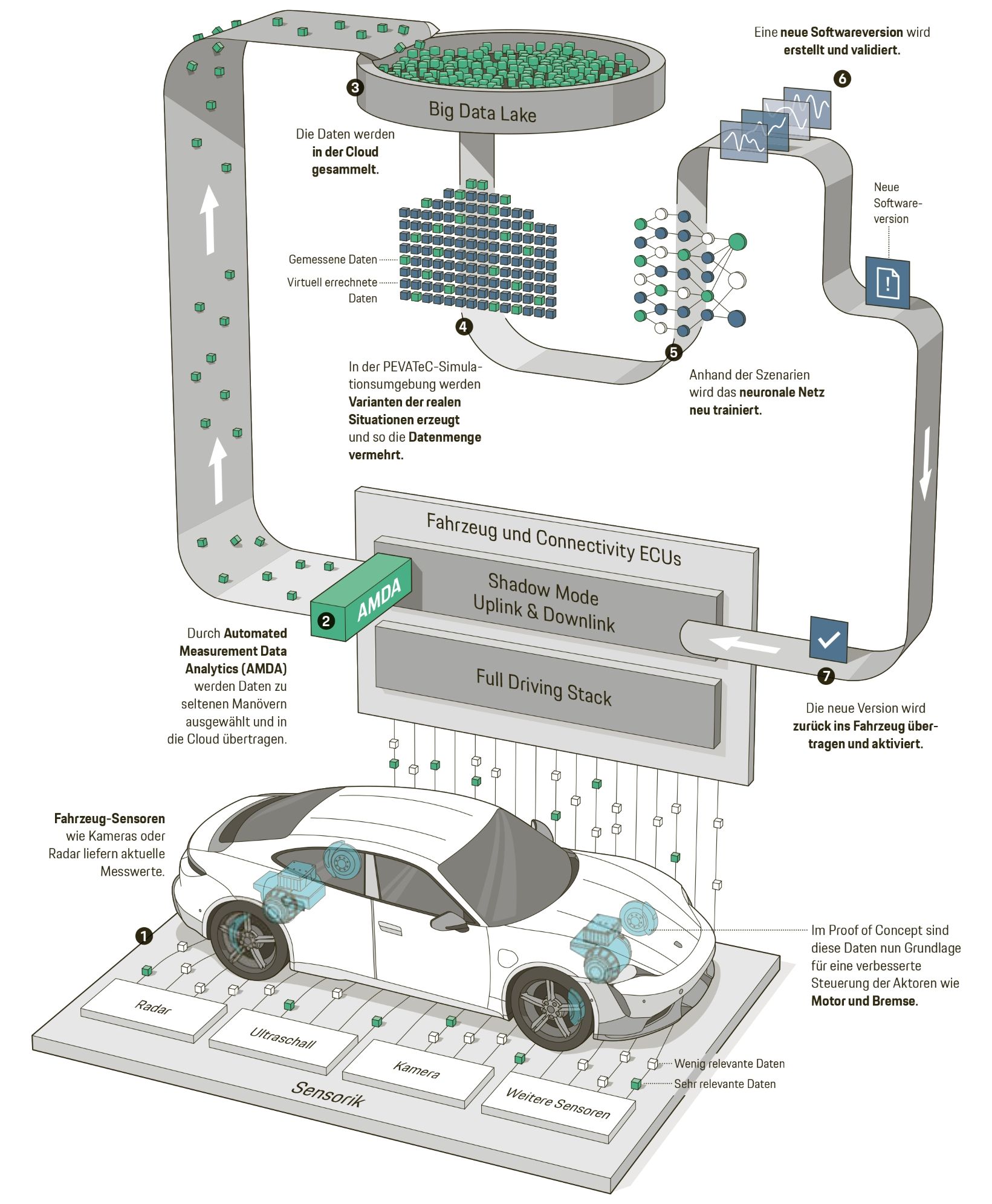 Wie kann ein autonomes Fahrzeug in gleicher Weise aus Erfahrungen lernen und ebenfalls intuitiv reagieren? Dieser Frage widmete sich Porsche Engineering gemeinsam mit der Porsche AG sowie CARIAD, Software- und Technologieunternehmen des VW-Konzerns, im Rahmen eines Proof of Concepts „Big Data Loop“. Die Serienentwicklung im Konzern wird nun bei den Software-Spezialisten von CARIAD vorangetrieben. Der Proof of Concept sollte zeigen, wie sich in Zukunft alle Funktionen, die auf Künstlicher Intelligenz (KI) beruhen, kontinuierlich weiterentwickeln lassen. Die Lösung gleicht dabei einem Kreislauf: Daten aus dem Fahrzeug werden drahtlos in die Cloud übermittelt und dort genutzt, um die KI weiter zu trainieren. Danach wird der verbesserte Algorithmus geprüft und wieder zurückgespielt.