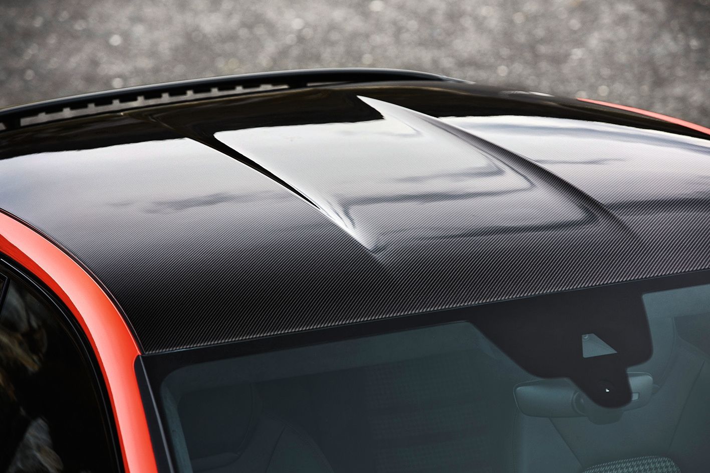 The optional contoured carbon roof features a notch down the center and an unmistakably sporty look reminiscent of the Porsche 911 GT3 RS. It is part of one of three lightweight sports packages.