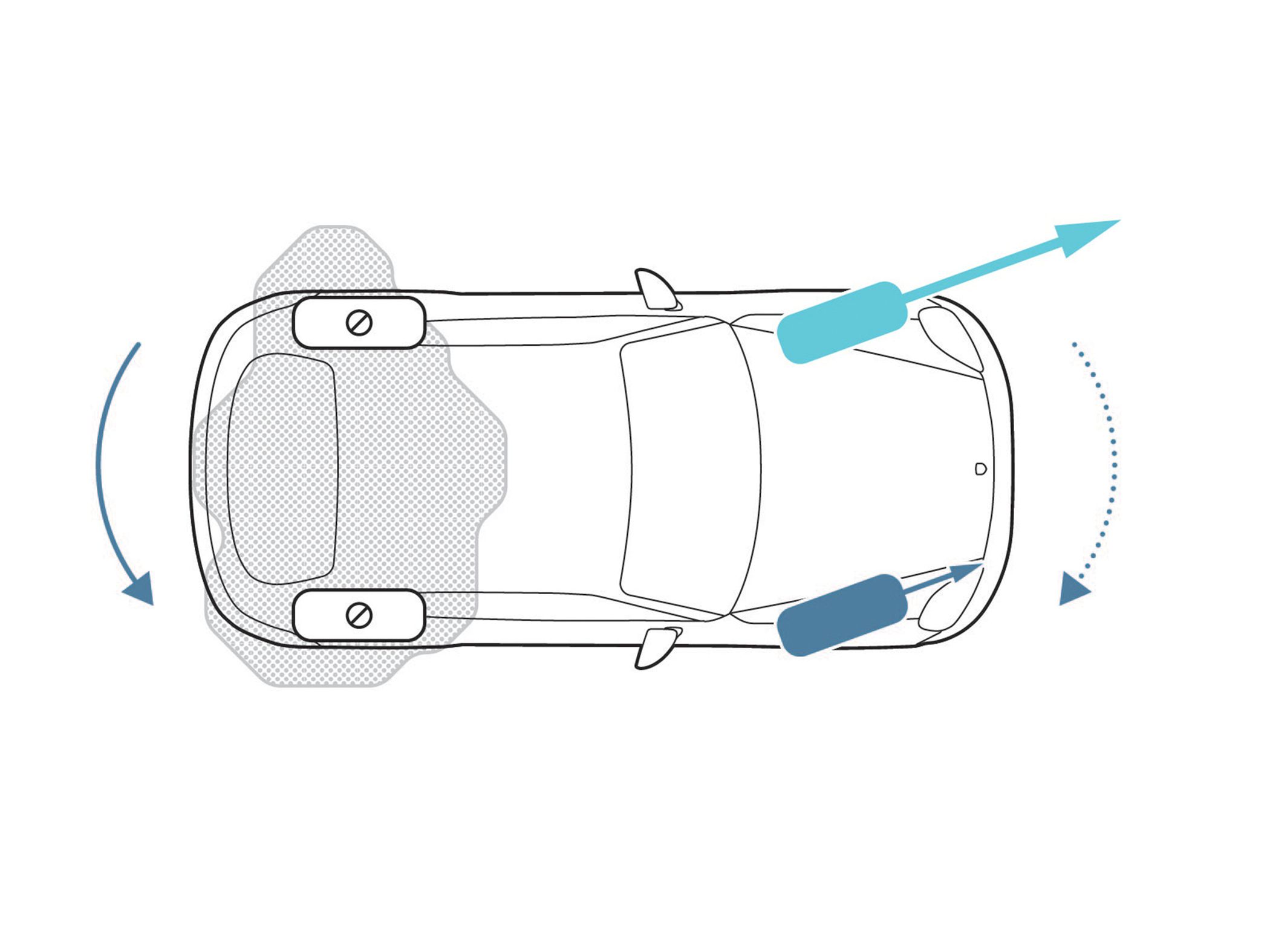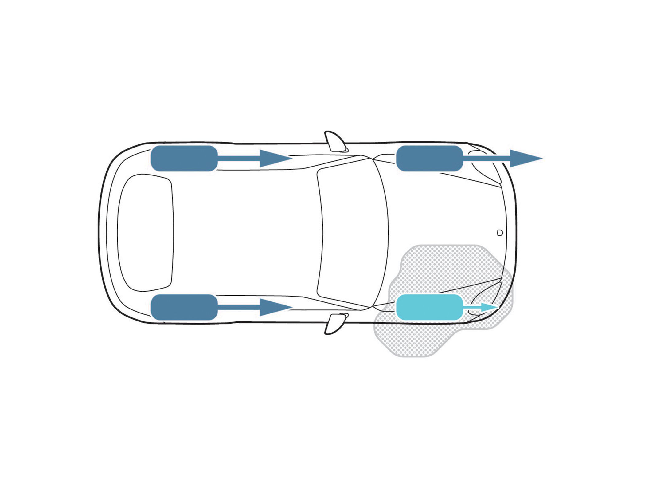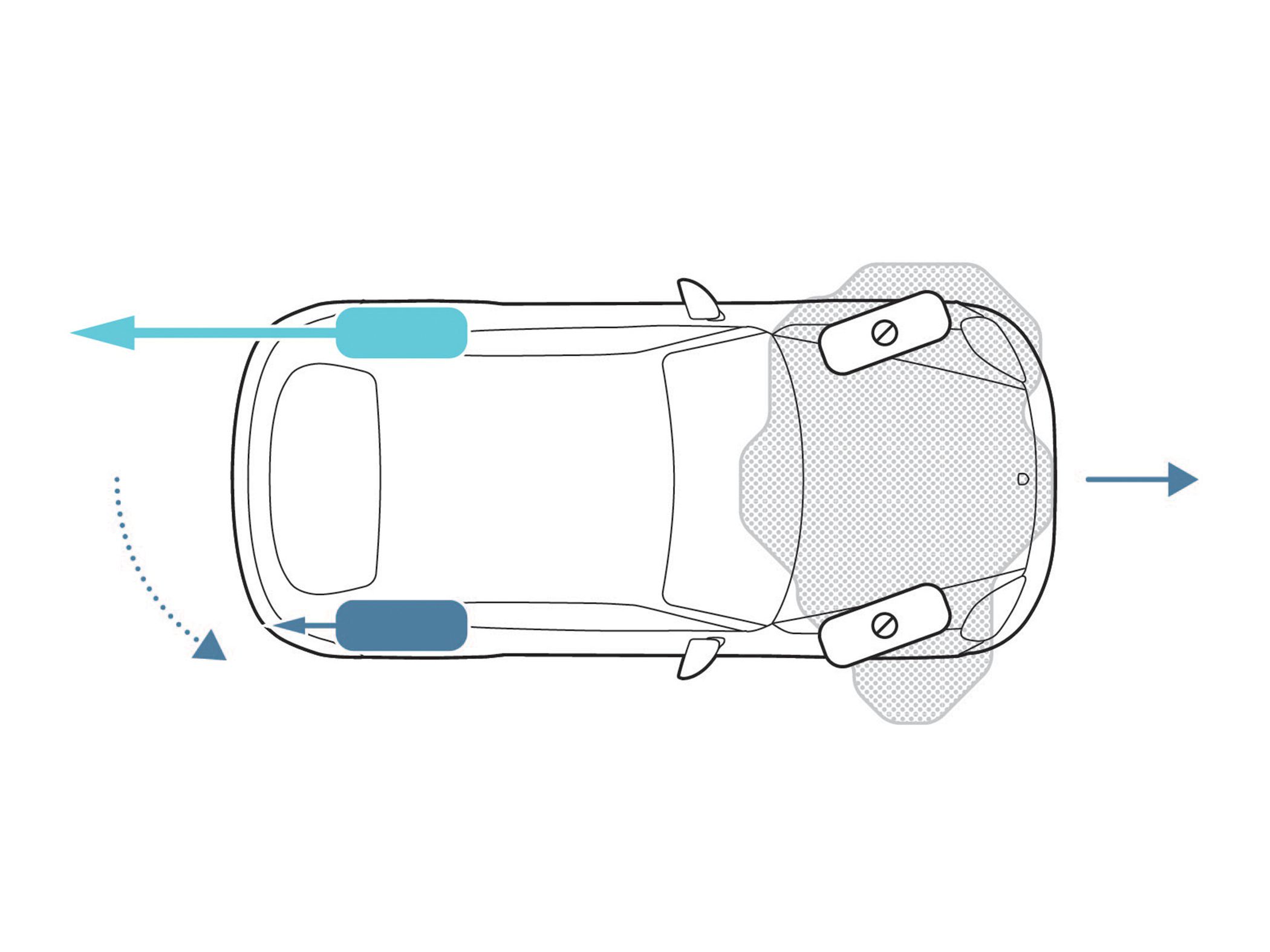 Situation 3: The driver wants to drive into a left-hand bend but the front wheels lose traction. The car travels straight ahead (forward arrow). The software takes the torque off the front wheels and brakes the rear left wheel significantly more than the rear right wheel to create angular momentum into the corner (dotted arrow).