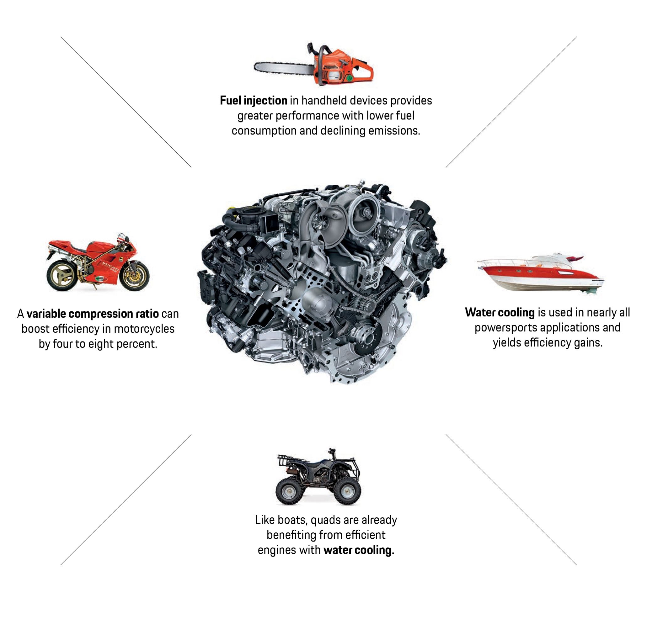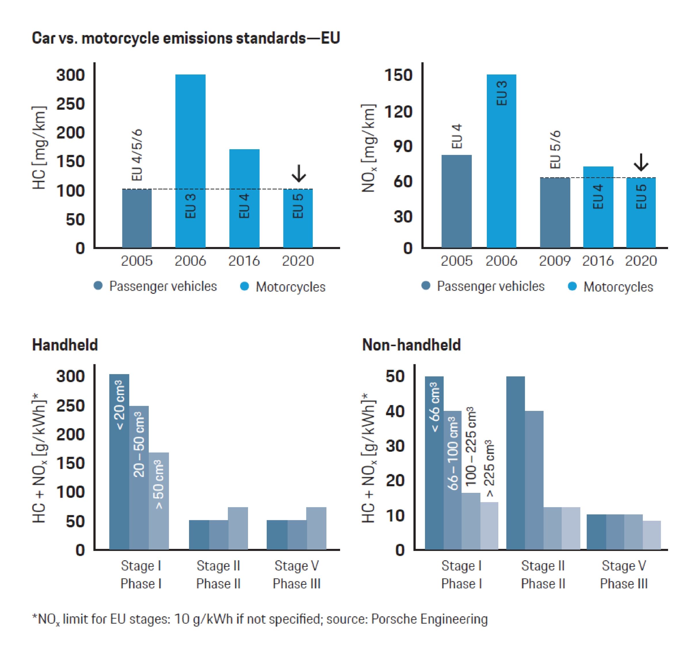 As in the automotive sector, motorcycles, handheld, and non-handheld devices are also subject to increasingly stringent limits for carbon monoxide, hydrocarbons, and nitrogen oxides. Compliance with those limits requires the transfer of efficiency technologies from the automotive sector.