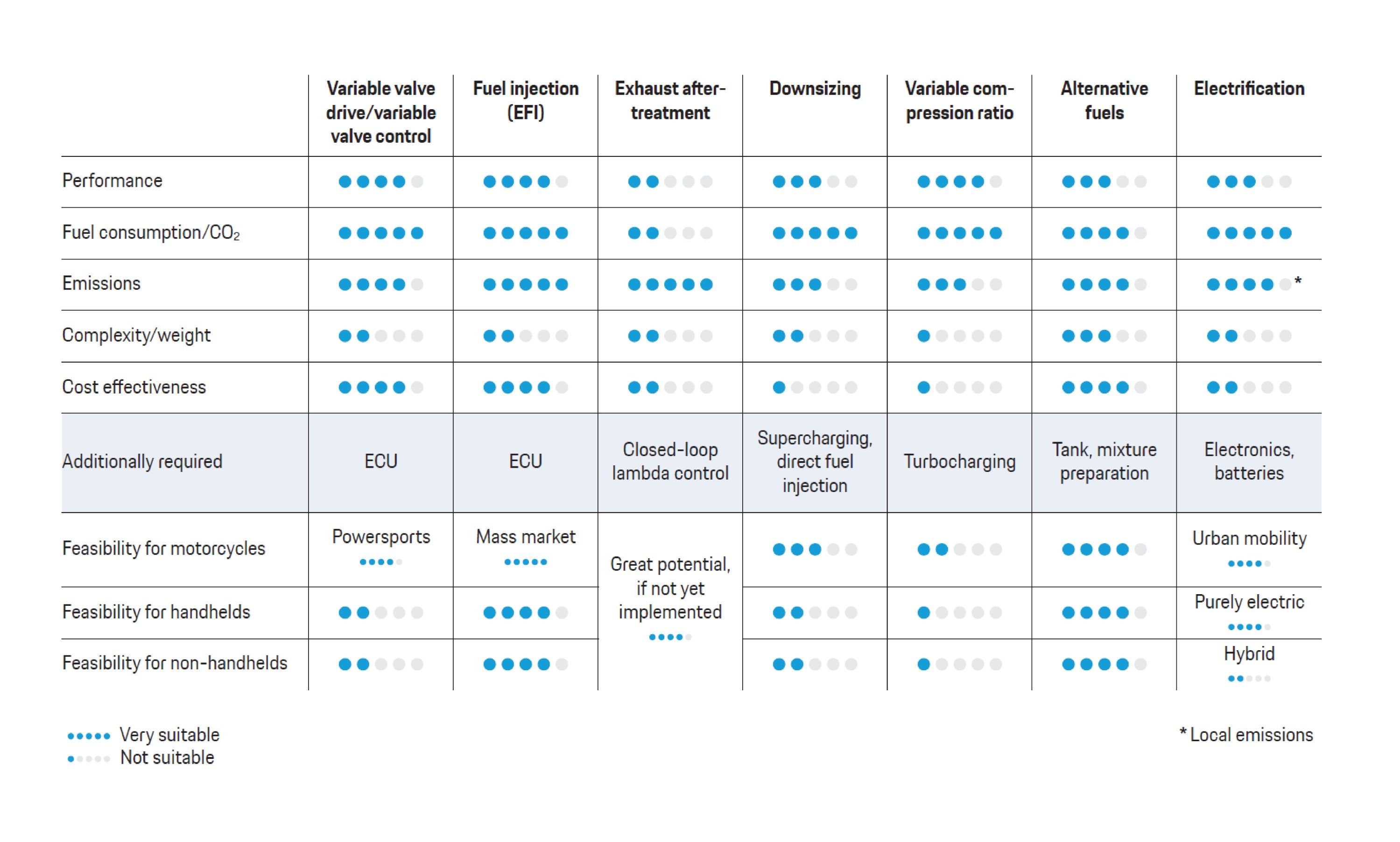 Porsche Engineering is well versed in all efficiency and environmental protection technologies in the gasoline engine area and can support companies in the non-automotive sector with the transfer of such technologies to their products—always bearing in mind specific requirements such as low costs or the lowest possible weight. However, not every technology is suitable for every product. “In each case a precise analysis must ascertain whether the defined objectives can be achieved in an economically viable manner,” says Fuoss. To provide better orientation, the experts from Porsche Engineering have examined technologies in terms of their use in motorcycles and handheld and non-handheld devices: alternative fuels, fuel injection, exhaust aftertreatment, variable valve drives, variable compression, down- and rightsizing, electrification, and water cooling.