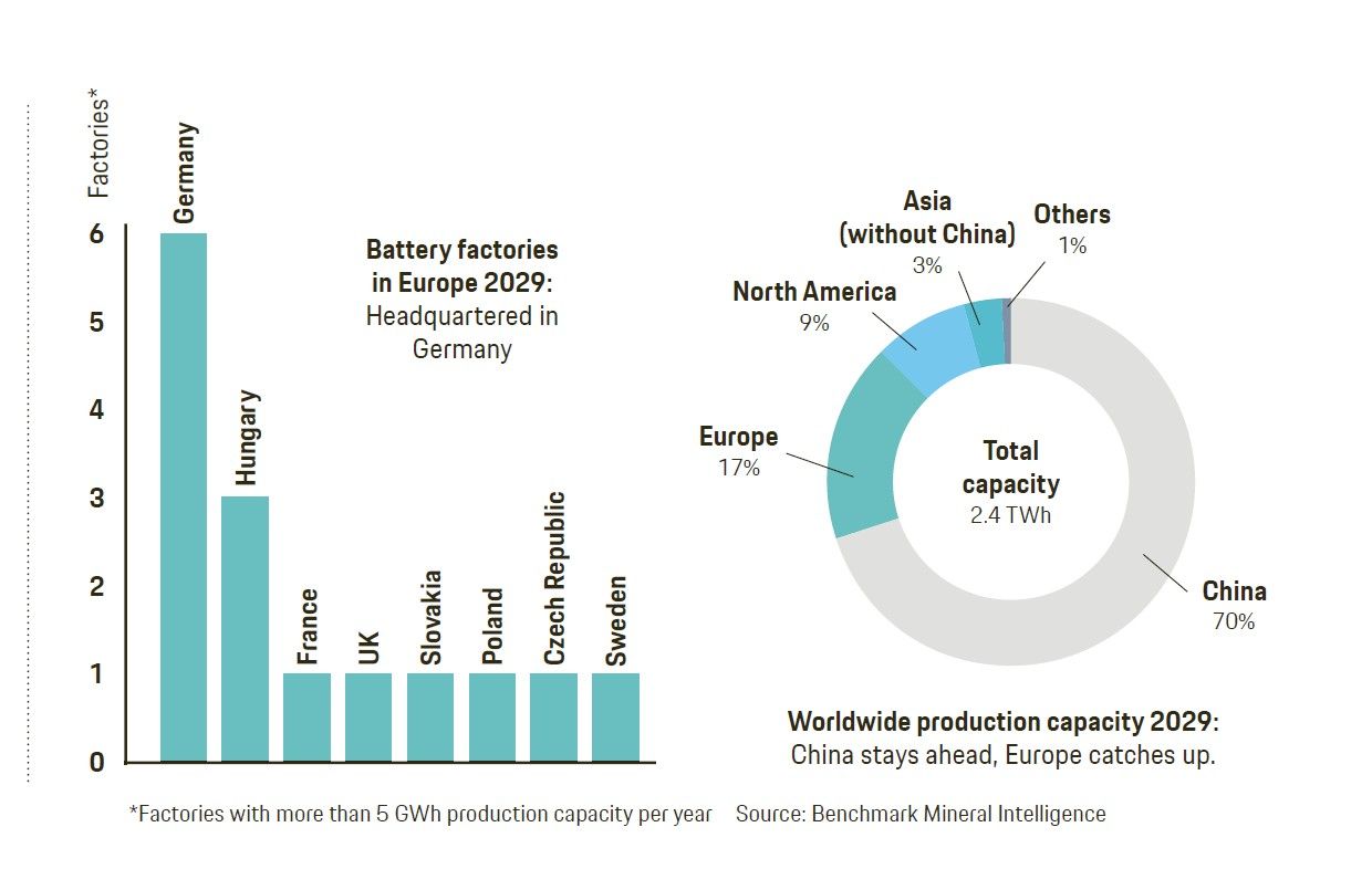 Although China will continue to have the largest production capacities for lithium-ion batteries by some distance, Europe, and Germany in particular, are catching up. By the end of the decade, factories with an annual capacity of 413.5 GWh and 173 GWh, respectively, are slated to be in place.