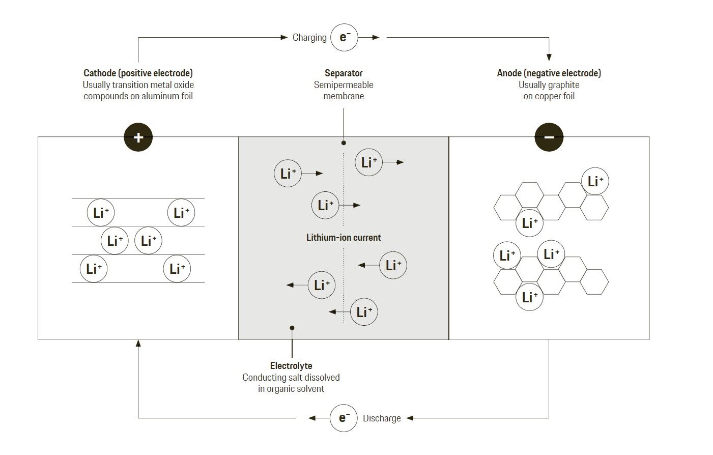 In lithium-ion batteries, the negative electrode (usually made of graphite) and the positive electrode (usually made of transition metal layer oxides) are divided by a separator. Positively charged lithium ions can freely pass through it in both directions. When discharging, electrons flow from the anode via the outer circuit to the cathode, while simultaneously positively charged lithium ions also go through the separator and migrate into the cathode structure. During charging, an external voltage drives the lithium ions back in the direction of the negative electrode. Lithium is particularly well suited for batteries because the lightest metal in the periodic table is very keen to give up one of its three electrons. At the same time, their high reactivity also results in lithium atoms easily forming chemical bonds. To prevent this, they must be protected from air and water inside the battery.