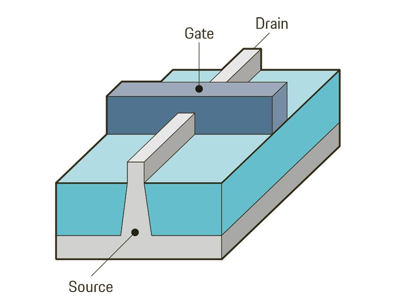 But even this trick could only keep Moore’s Law alive for a few years. For this reason, chip manufacturers began using a new transistor architecture for even smaller components in the first half of the 2010s: the FinFET. The conductive channel between the source and drain terminals is shaped like a fin and is enclosed on several sides by the gate. “This makes it much easier to control the current flow in the transistor,” says Riel. “FinFETs starting at 22 nm in structure size were used and are now standard in integrated circuits.”