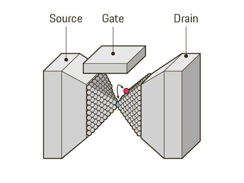 In the TFET (left), unlike the MOSFET, the source and drain are differently doped. It uses the quantum mechanical tunnel effect: the voltage between gate and source determines whether charge carriers can “tunnel” through the energetic barrier between source and drain and whether a current flow is possible. In the CNFET (center), the channel between source and drain consists of carbon nanotubes. Here too, the gate-source voltage determines the current flow. In the single-atom transistor (right), the voltage between source and gate shifts a single atom, which either closes or opens the circuit between source and drain (green/red position).