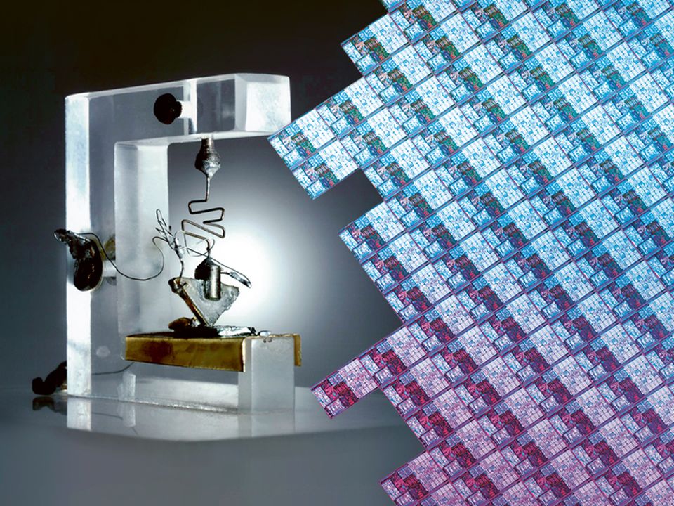 The birth of modern electronics took place on December 16, 1947 at Bell Labs in Murray Hill, New Jersey. It was then that physicist Walter Brattain succeeded for the first time in amplifying an electric voltage with an improvised semiconductor component. The transistor was born. For the first time, an alternative to the bulky, unreliable, and energy-hungry vacuum tubes was available. From an appearance standpoint, Brattain’s laboratory set-up, consisting of a germanium plate, a plastic triangle, gold foil, and a paper clip, had very little in common with modern chips—but it did herald the era of personal computers, smartphones, and self-propelled cars.