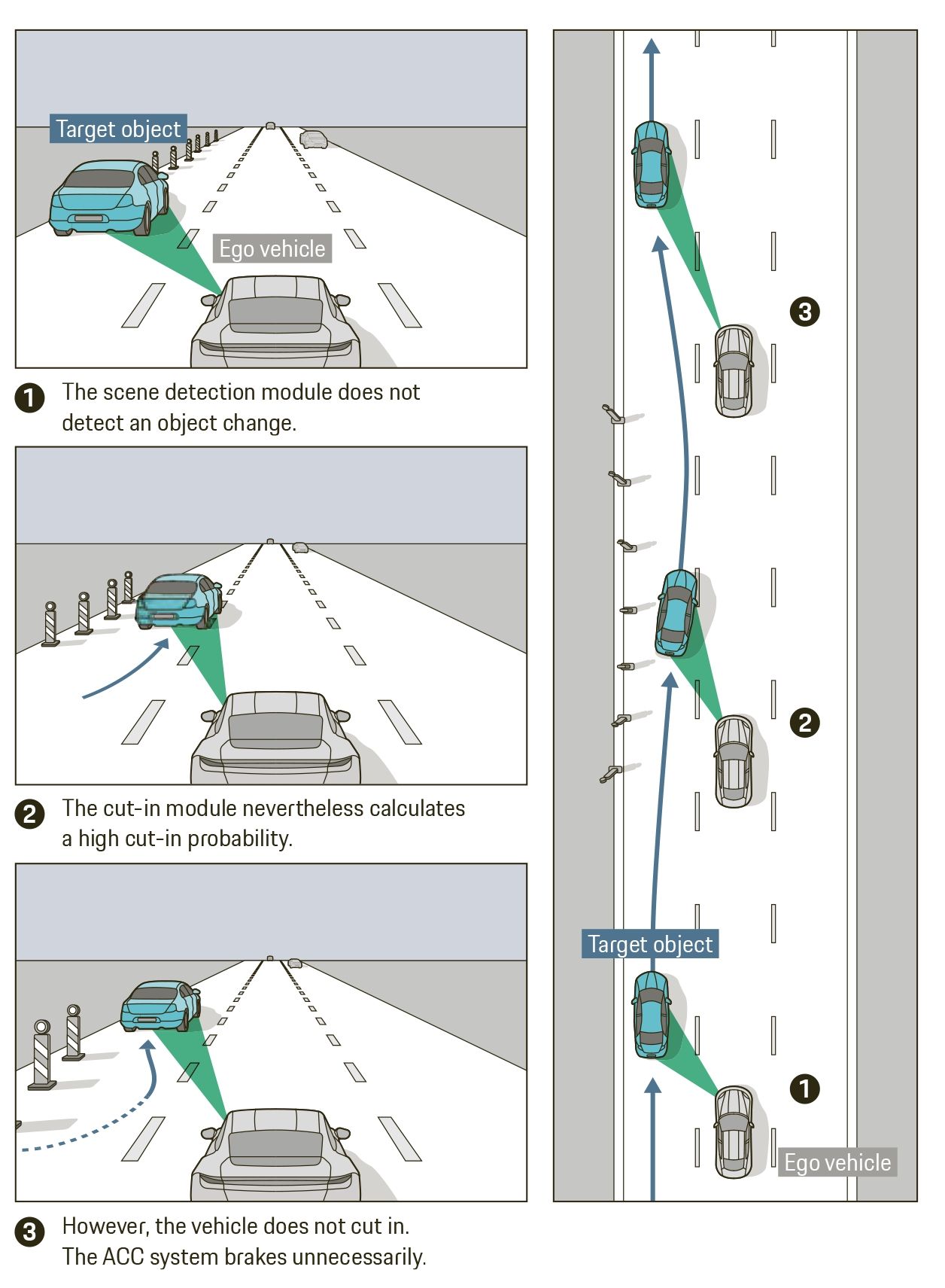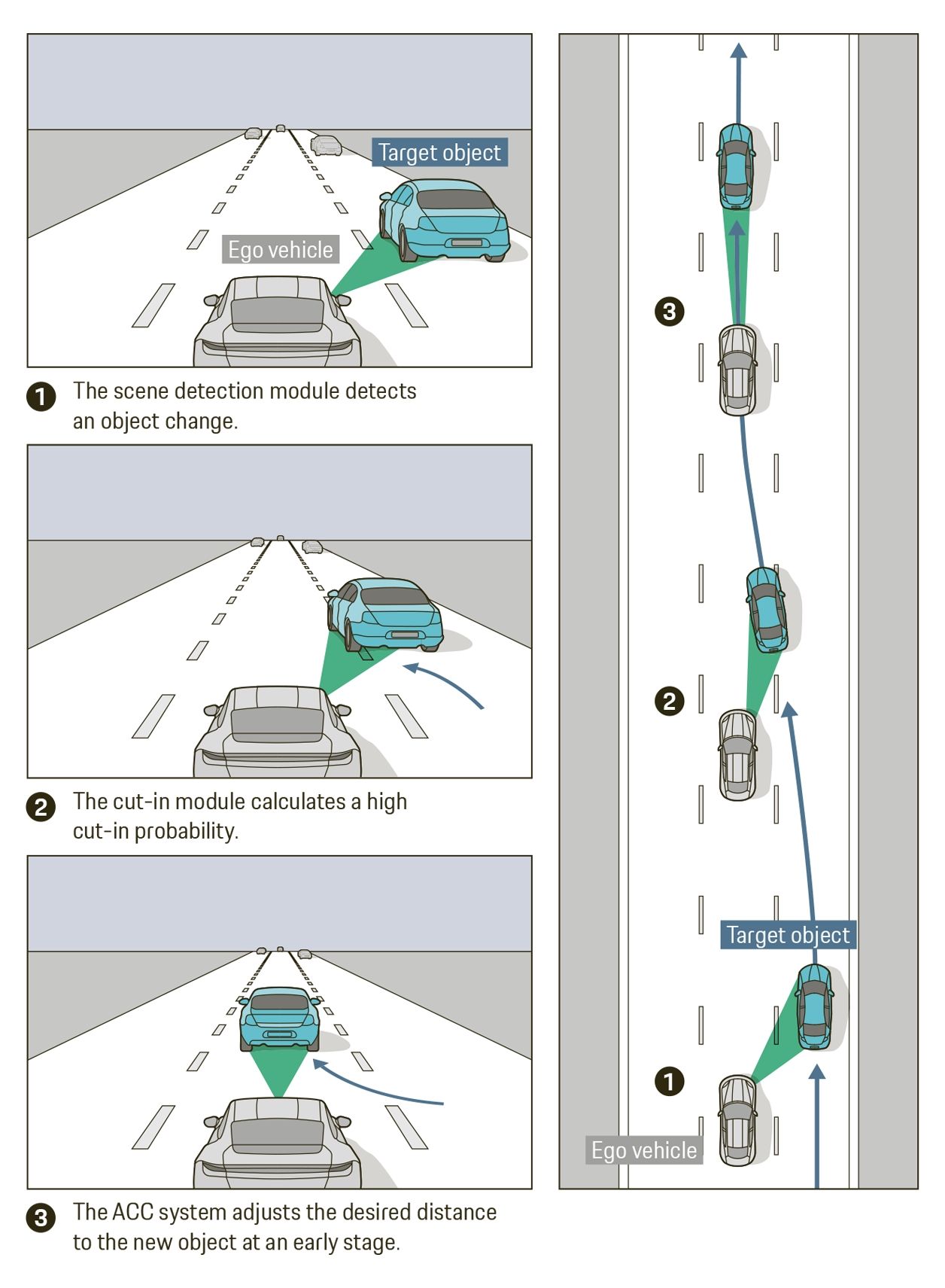 The cut-in detection system should correctly predict whether another vehicle is about to change lanes. If so, the Adaptive Cruise Control (ACC) can brake gently and early.