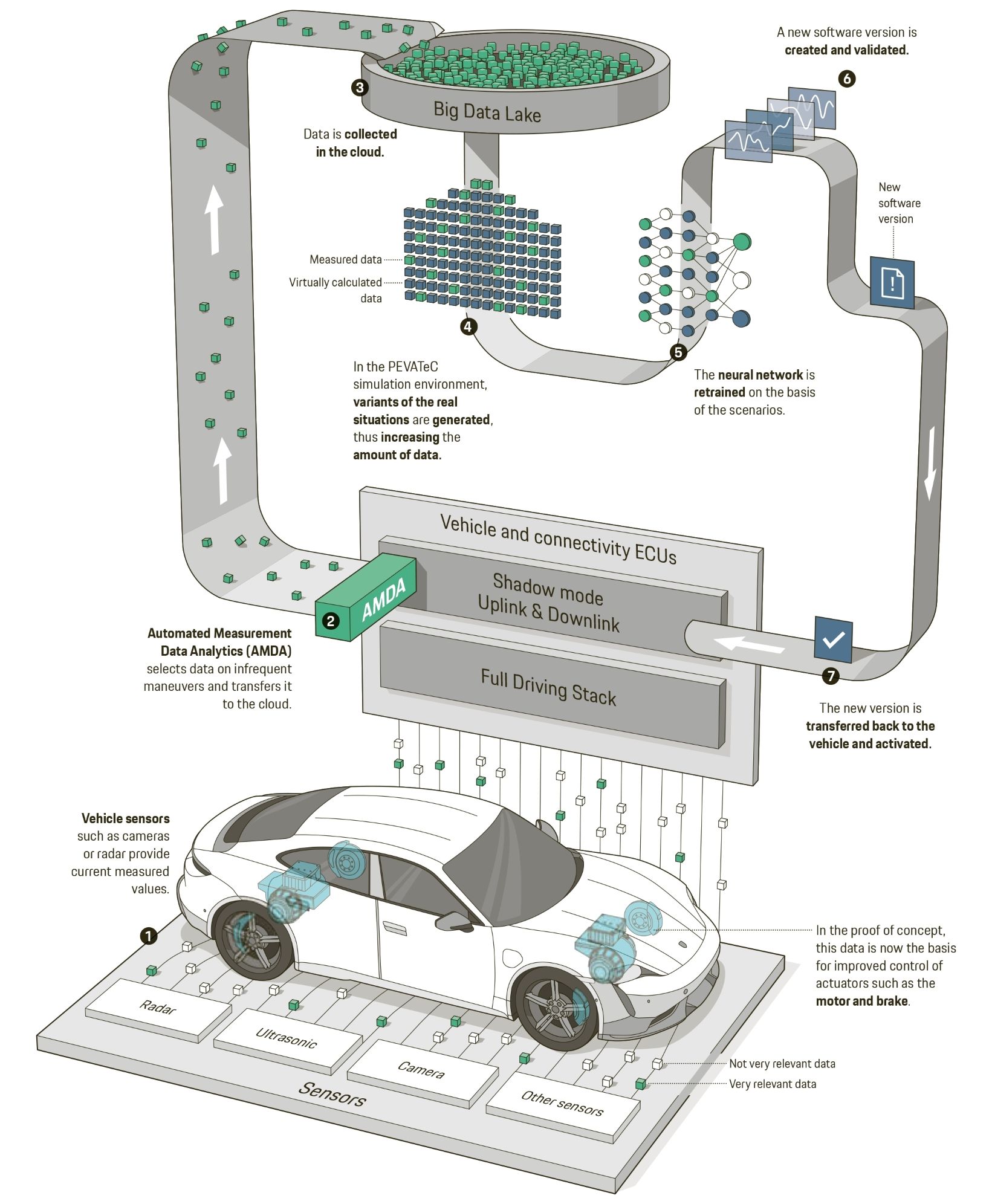 How can an autonomous vehicle learn from experience in the same way and also react intuitively? Porsche Engineering addressed this question together with Porsche AG and CARIAD, a software and technology company of the VW Group, as part of a Big Data Loop proof of concept. The software specialists at CARIAD are now pushing ahead with series development within the Group. The proof of concept was intended to demonstrate how all functions based on artificial intelligence (AI) can be continuously developed in the future. The solution resembles a circuit: Data from the vehicle is transmitted wirelessly to the cloud, where it is used to further train the AI. Afterwards, the improved algorithm is tested and fed back again.