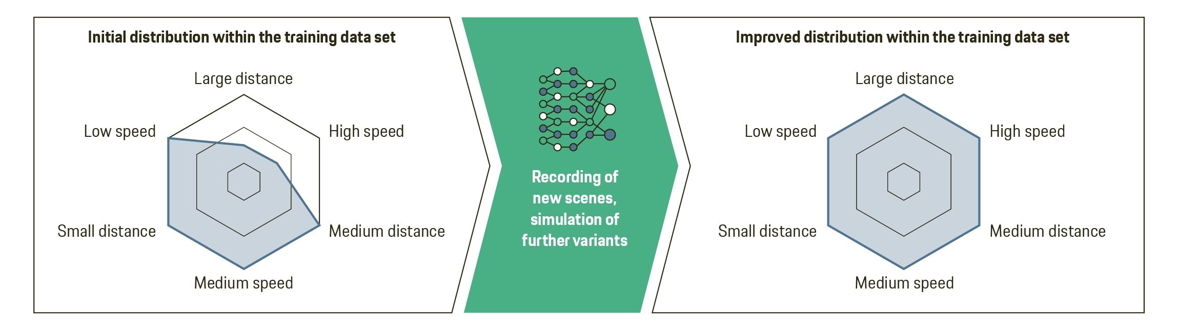 Every modern vehicle with assistance systems produces enormous amounts of data (Big Data), including evaluated camera signals or information from radar sensors—so there is plenty of material to train a neural network. What appears to be a simple idea at first glance, however, turns out to be a real challenge when it comes to implementation. “For example, we only want to record the data that really helps the system move forward,” says project manager Philipp Wustmann, an expert in longitudinal and lateral control at Porsche Engineering. “That's no easy task, because radar sensors and cameras generate an immense amount of data, most of which is not relevant to the function under consideration.” Driving on an empty highway, for example, offers no learning opportunities for a distance controller. Moreover, evaluating all the data would be far too time-consuming.