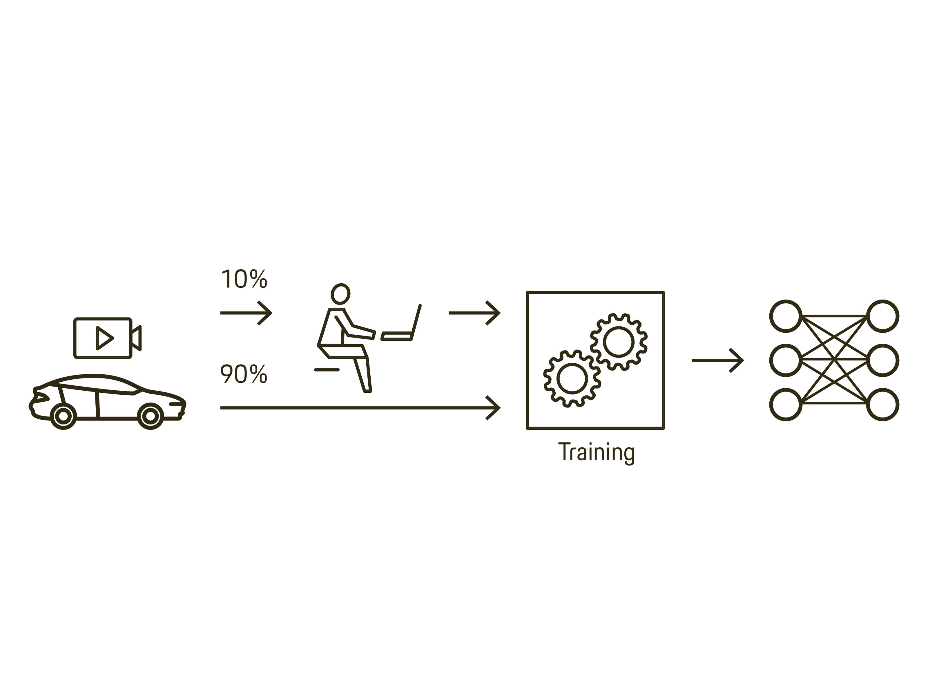 This kind of learning gobbles up enormous resources. “Today, it takes 70,000 graphics processor hours to train an autopilot,” explains Tobias Kalb, a doctoral student involved in the AI Delta Learning project for Porsche Engineering. In practice, numerous graphics processing units (GPUs) are used in parallel to train neural networks, but the effort is still considerable. In addition, a neural network needs annotated images, that is images from real traffic events in which important elements are marked, such as other vehicles, lane markings, or crash barriers. If a human performs this work manually, it takes an hour or more to annotate a snapshot from city traffic. Every pedestrian, every single zebra crossing, every construction site cone must be marked in the image. This labeling, as it is known, can be partially automated, but it requires large computing capacities.