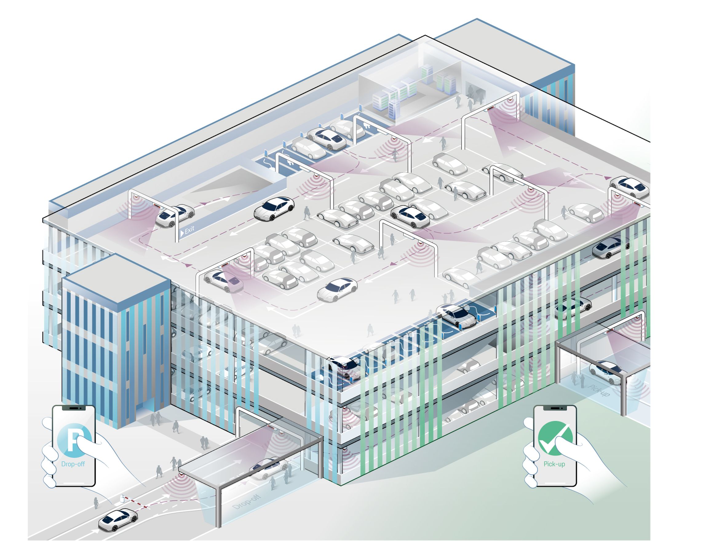 Wi-Fi or 5G transmitters are installed throughout the parking garage for remote control of the vehicles. Infrastructure sensors such as cameras or laser scanners continuously observe the cars as they drive through the parking garage. In critical situations or when the radio connection is interrupted, the vehicle is stopped immediately.