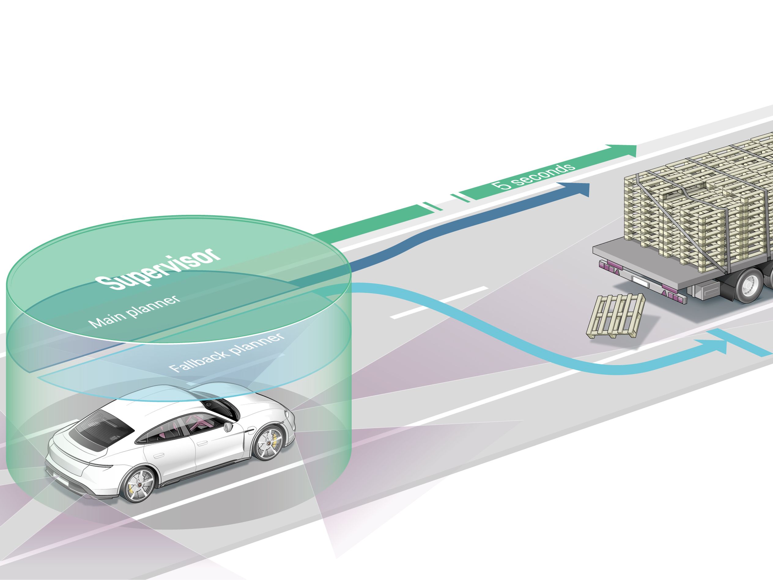A truck in front loses its load. An unloaded pallet suddenly falls onto the road and blocks the lane. What causes a moment of shock for a human driver today will be mastered with ease by the highly automated vehicles of the future. The reason is that it works with three parallel systems: The main planner handles normal driving operations and acts in a comfortoriented manner. It brakes and accelerates gently. System two, the fallback planner, simultaneously calculates a trajectory that quickly maneuvers the vehicle into a safe position if necessary. The third system, the supervisor, constantly checks whether a risk is posed by the main or the fallback path and selects the safest alternative in each case. That’s why a pallet falling out of the truck unexpectedly would not be a problem for the highly automated vehicle. Because even in the unlikely event that the main planner overlooked the obstacle, the vehicle would safely take evasive action thanks to the fallback planner—or stop anner—on the shoulder if it were not possible to drive around it.
