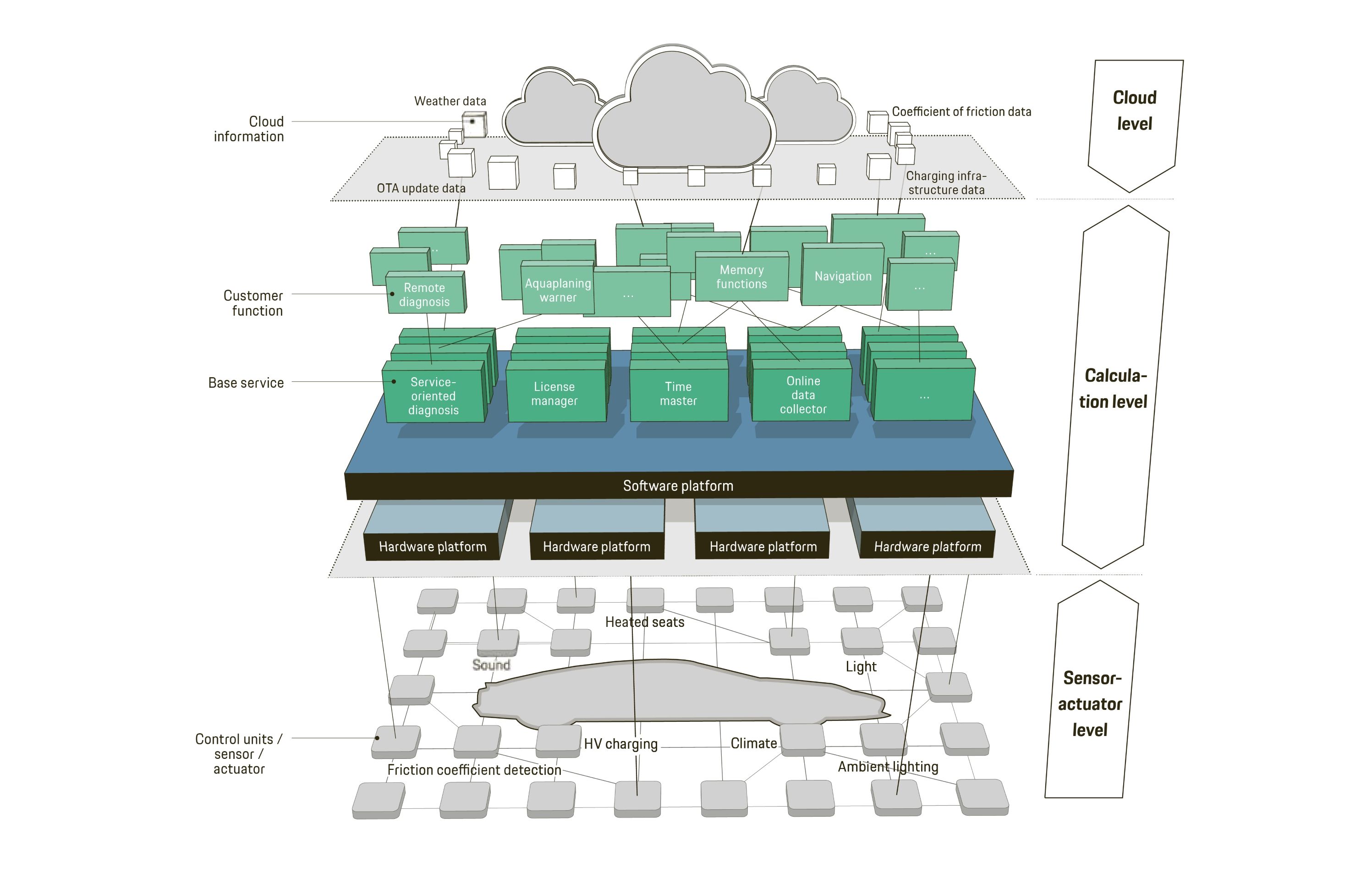 The vehicles of the future will have revolutionary functions. In addition to current trends such as electromobility, connectivity and autonomous driving, the need to network the vehicle with the environment will increasingly become the focus of future architectures. Applications in subject areas such as remote update and diagnosis, car-2-infrastructure and big-data and cloud functions will play an increasingly important role in the future. In order to implement modern functions in the vehicle and thus keep it up-to-date and maximally useful for the customer, Porsche is continuously developing a new E³ architecture (End-2-End Electronics architecture). Its structure is open and modular—based on a holistic approach of an end-to-end architecture with a vehicle backend as an integral component. It comprises several levels: the sensor-actuator level includes functions such as sound, light, heating, and ambient lighting. The basic services and customer functions such as navigation, remote diagnosis, or the aquaplaning warner run on the computing level. The final level is the cloud level: this level contains information that is stored in the cloud, such as weather or friction coefficient data. In addition to new demands on the technical infrastructure, such as high-performance central processing units, high-speed networking, new diagnostic concepts, and adequate security concepts, the E³ architecture also focuses on the consideration of corresponding changes in the environment of associated development processes and collaboration models. The trend towards shifting functions from the vehicle to the vehicle backend requires a consistent and service-oriented software architecture—both in the vehicle and in the backend. It enables the cross-domain interoperability of all services and the seamless usability of powerful cloud services. With the help of the E³ architecture, the vehicle is integrated into an overall ecosystem of services, which will provide the customer with a variety of new functions in the future—and enable a new level of comfort and mobility.