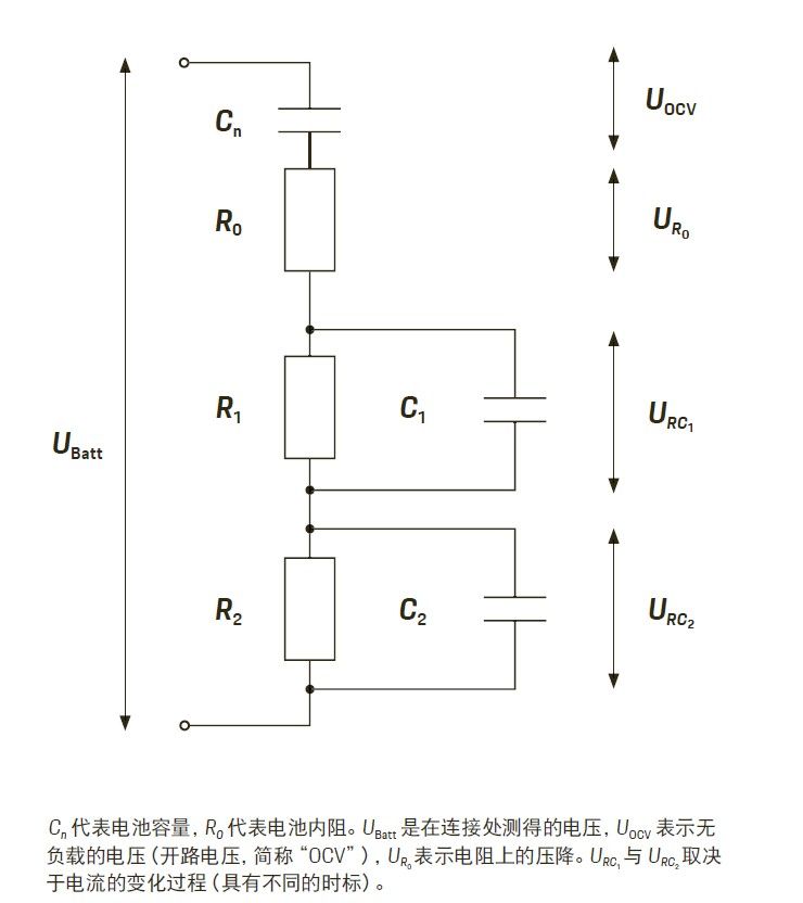 可将真实的电池视为理想电压源与电阻器(R)和电容器(C)的组合而建模。通过这种方法可以描述电池在静态和动态负载下的行为特征,例如电流上升时电压会下降。