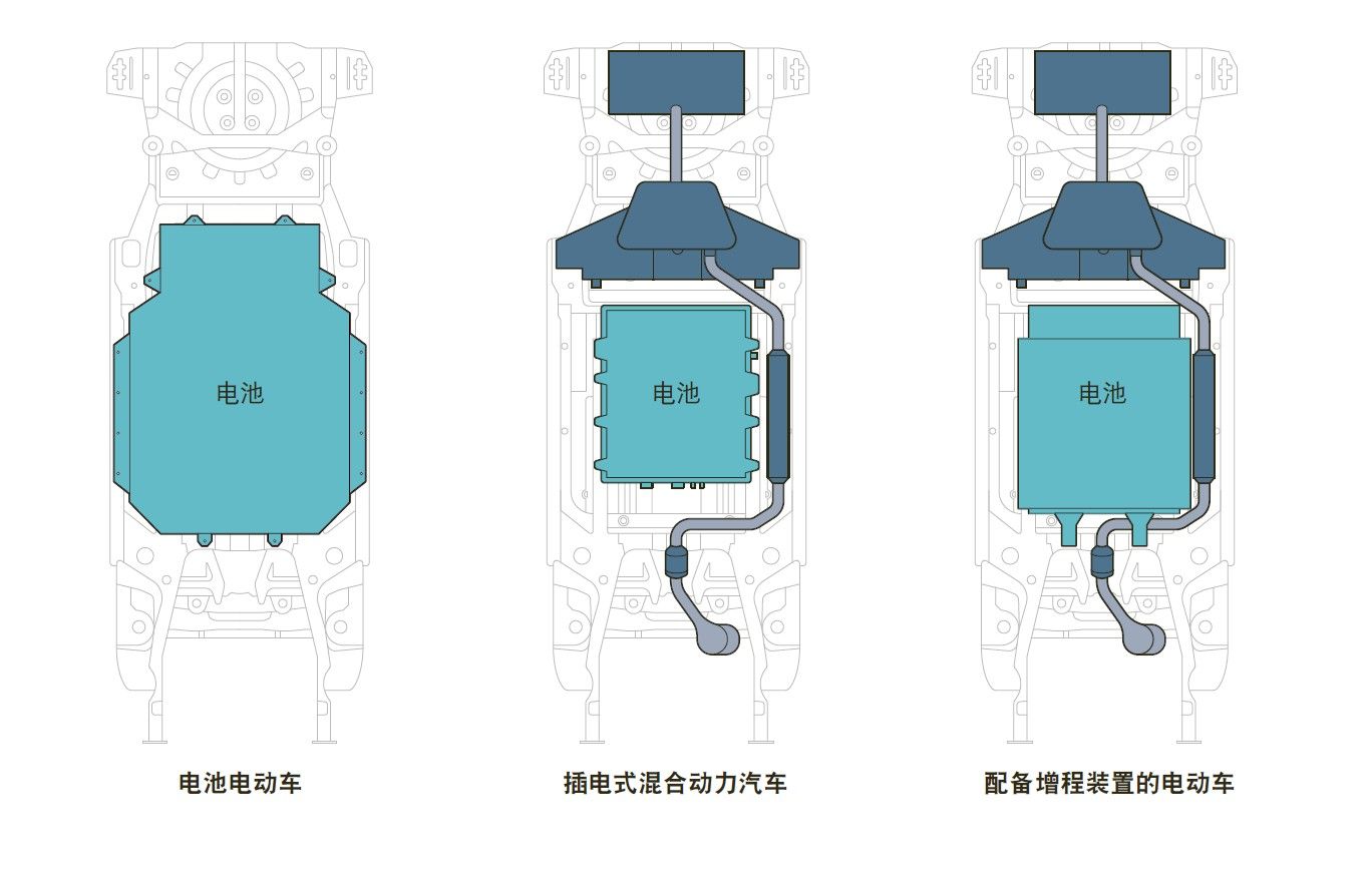 通用底盘结构的不同安装位置中,可安装各种电动车型的大小不一的电池。纯电动汽车的电池需要占用整个可用空间。在配备增程装置以及混合动力驱动的车型中,相对较小的电池组的后方可用于安放内燃机的燃油箱。