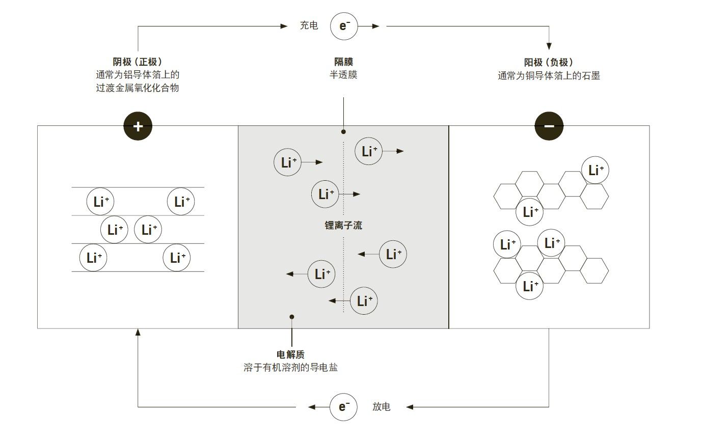 在锂离子电池中,负极(通常由石墨制成)和正极(通常由过渡金属层状氧化物制成)通过隔膜隔开。带正电的锂离子可以在两个方向上自由移动。放电时,电子由阳极通过外部电路流向阴极,同时带正电的锂离子也会穿过隔板移动至阴极,并迁移到阴极结构中。充电时,外部施加的电压使锂离子移动回到负极。锂特别适合用于电池,因为锂作为所有元素中最轻的金属,特别容易释放其三个电子中的一个。同时,高活性也意味着锂原子容易形成化学键。为防止这种情况,必须防止电池中进入空气或水。