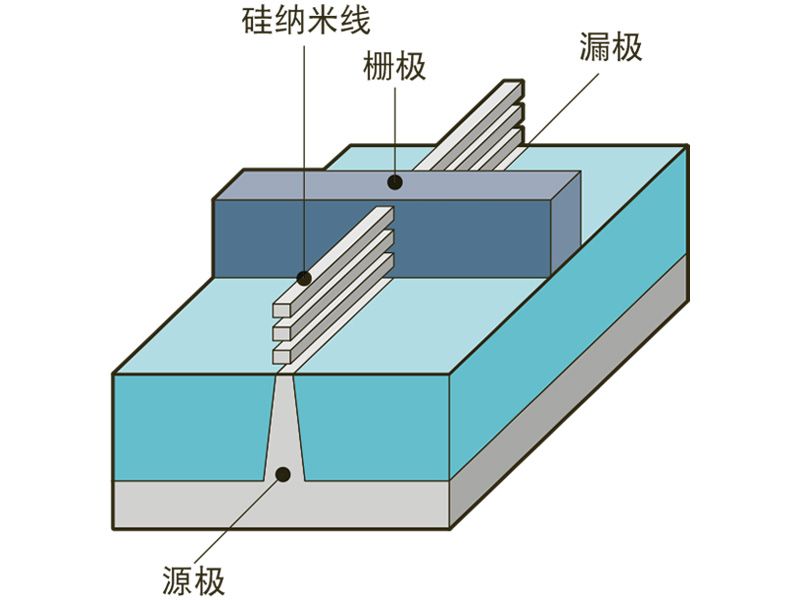 数十年来,作为开关的 MOSFET(左图)一直是数字电路中的关键元件,并且正是由于其尺寸不断缩小,摩尔定律才得以延续下去。栅极和源极之间的电压决定了从源极流向漏极的电流。在FinFET(中图)中,通道的形状呈鳍片形(英文“fin”),因此栅极可以从三个侧面环绕通道。与 MOSFET 相比,这种结构改善了对电流的控制,MOSFET 的栅极只能从上方作用在通道上。在 GAAFET(右图)中,由硅纳米线制成的通道被栅极完全环绕。这是控制电流的最佳几何形状。