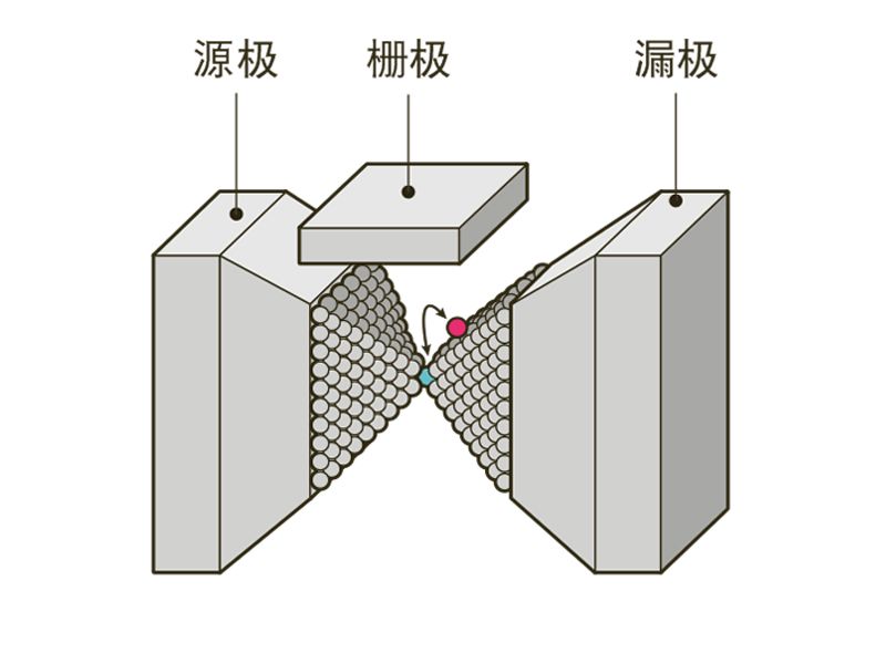 在隧道场效应晶体管(TFET,左侧)中,源极和漏极的掺杂方式与 MOSFET 不同。TFET 利用了量子隧道效应,其栅极和源极之间的电压决定了带电粒子是否可以“穿隧”源极和漏极之间的势垒,以及是否会产生电流。在碳纳米管场效应晶体管(CNFET,中间)中,源极和漏极之间的通道由碳纳米管组成。在这种技术中,也是栅极电压决定了电流。在单原子晶体管(右侧)中,源极和栅极之间的电压会移动单个原子,从而闭合或断开源极和漏极之间的电路(绿色/红色位置)。