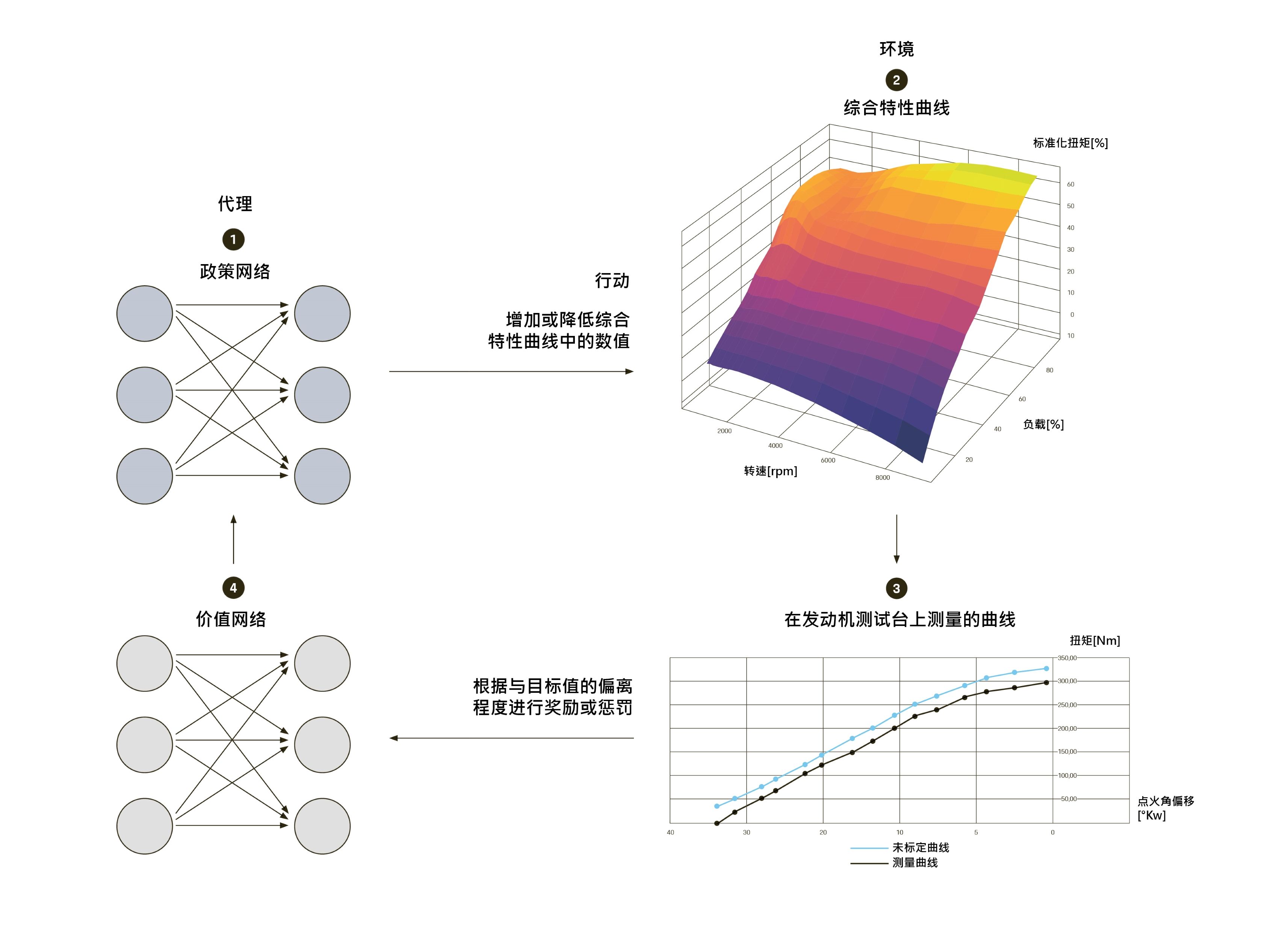 在训练过程中,系统会学习给定扭矩模型校准的最佳应用方法。在综合特性曲线的特征点上,它将标定值与测量数据集里的值进行比较,并根据所得到的奖励分,借助神经网络来近似计算效用函数。第一个神经网络可以预估目前未知状态的奖励。然后,第二个神经网络,即所谓的政策网络会预测在特定状态下,哪种行动会带来最大的收益。