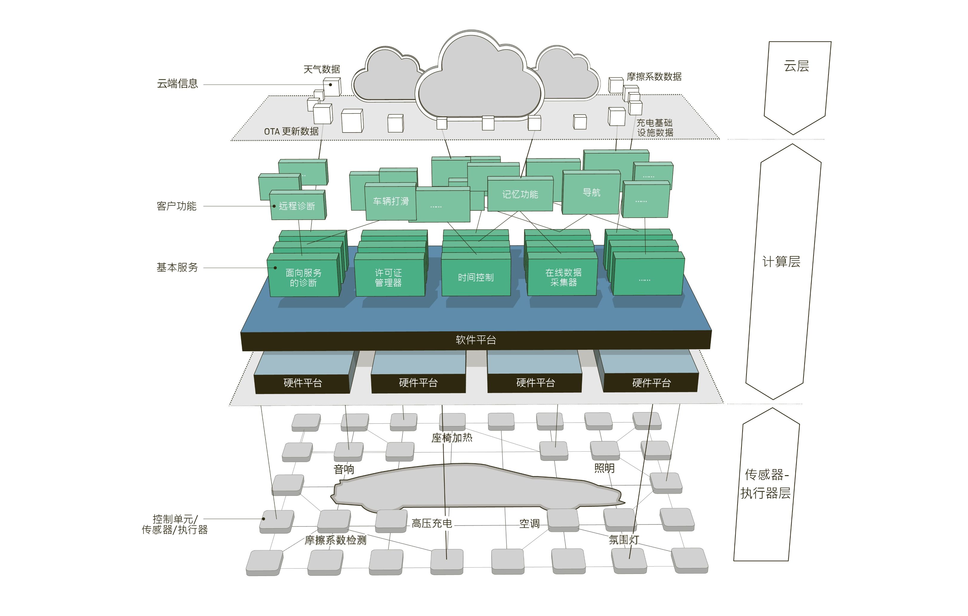 未来的汽车将具备革命性的功能。除了当前的电动汽车、互联互通和自动驾驶等趋势外,车辆与环境联网的需求也越来越成为未来架构的重点。在远程更新和诊断、车辆到基础设施、大数据和云功能等主题领域的应用将在未来发挥愈发重要的作用。为了在车辆中实现现代化的功能,从而令客户的爱车始终与时俱进、表现卓越,保时捷始终坚持开发全新的 E³ 架构(端到端电子架构)。它的结构是开放且模块化的,基于端到端架构的整体方法,将车辆后台视为不可分割的组成部分。这个架构包含几个层次:“传感器-执行器层”包括声、光、加热和氛围灯照明等功能。基本服务和客户功能,例如导航、远程诊断或车辆打滑警告等都在“计算层”上运行。最后一层是“云层”:这里是存储在云端的信息,如天气或摩擦系数数据。除了对科技基础设施提出新的要求之外,例如高性能的中央处理单元、高速网络、全新的诊断理念和充分的安全理念等,E³ 架构还注重考虑相关开发流程和合作模式的环境中的相应变化。功能从车辆转移到车辆后台的趋势,要求在车辆和后台都有一个一致的、面向服务的软件架构。它实现了所有服务的跨域互通,并能够无缝对接强大的云服务。在 E³ 架构的帮助下,车辆被整合到一个整体服务生态系统中,该系统未来将为客户提供各种新功能,并使汽车的舒适性和移动性达到一个新的高度。