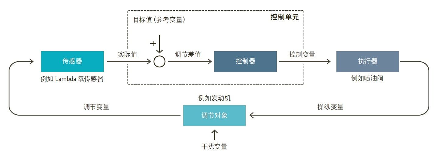 传感器为电子控制单元提供输入数据,电子控制单元将这些测量后的实际值与目标值进行对比。如果实际值偏离设定值,控制单元将通过执行器启动相应的修正。