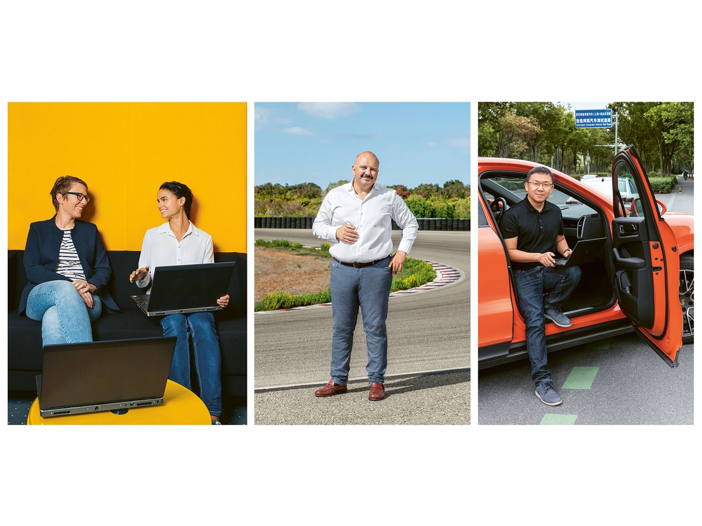 团队合作:蒂尔·卡罗琳·鲁普、克拉拉·玛丽娜·马丁内斯、皮尔波阿洛·波西塔诺和许正君(左起)等专家在比蒂希海姆-比辛根、纳尔德奥和上海研发基地开展合作,为高度自动化驾驶保驾护航。